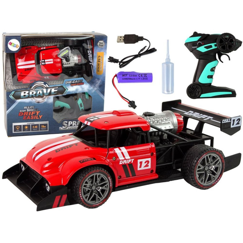 Iga poiss unistab kiiretest sportautodest, mis näevad välja nagu päris, seetõttu tutvustamegi seda automudelit. See mänguasi rõõmustab mitte ainult kõige nooremaid, vaid kindlasti ka vanemaid lapsi. Ideaalne kodusteks võidusõitudeks. Mängimise käigus arendab laps kindlasti oma käelisi oskusi ja parandab vilumust. Mänguasi on lastele ohutu! Autol on kerge ja vastupidav konstruktsioon ning sportlik välimus punases värvitoonis. Kummist rehvid tagavad sõiduki juhtimisel hea haarduvuse pinnaga. Lastele sõiduki juhtimise lihtsustamiseks on komplektis pult, millel on erinevate funktsioonide jaoks nupud. Kõige olulisemad puldinupud võimaldavad autot juhtida edasi ja tagasi ning paremale ja vasakule. Lisaks on puldil automaatjuhtimise nupp ning nupp auto väljalaskeava valgustamiseks. Auto väljalaskel on ka ava, kuhu pipeti abil vett lisades tekib auru efekt. Autol süttivad liikumise ajal ka esituled. Maksimaalne kiirus on 15 km/h.