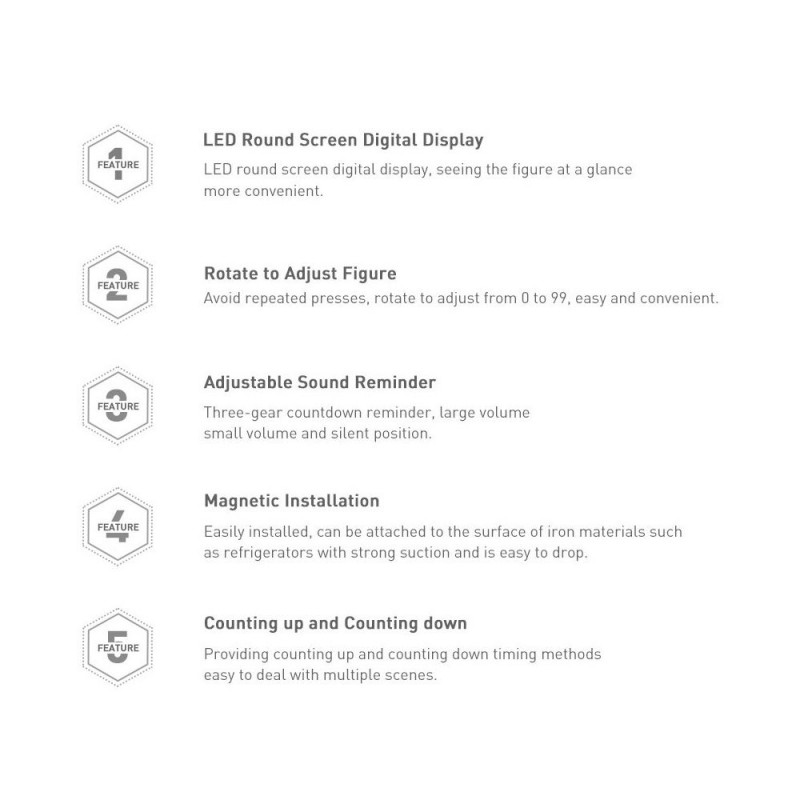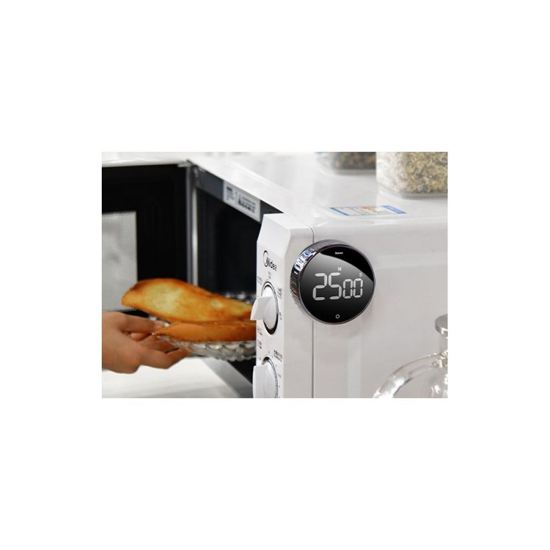 Baseus taimerit saate kasutada igal ajal päeval või öösel. Selle eest vastutab sisseehitatud LED-valgustus. Tänu oma ümarale kujule näeb vidin igas asendis suurepärane välja, olenemata sellest, kuhu te selle asetate. Lisaks on sellel helisignaal ja võimalus arvestada aega kahte erinevat moodi - kahanevalt ja kasvavalt. Ajavahemik on 0 kuni 99:55 minutit.