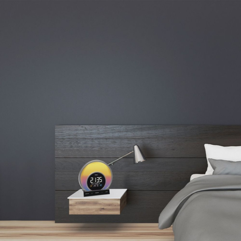 - Gentle wake-up with gradually brightening light and/or slowly increasing alarm tone