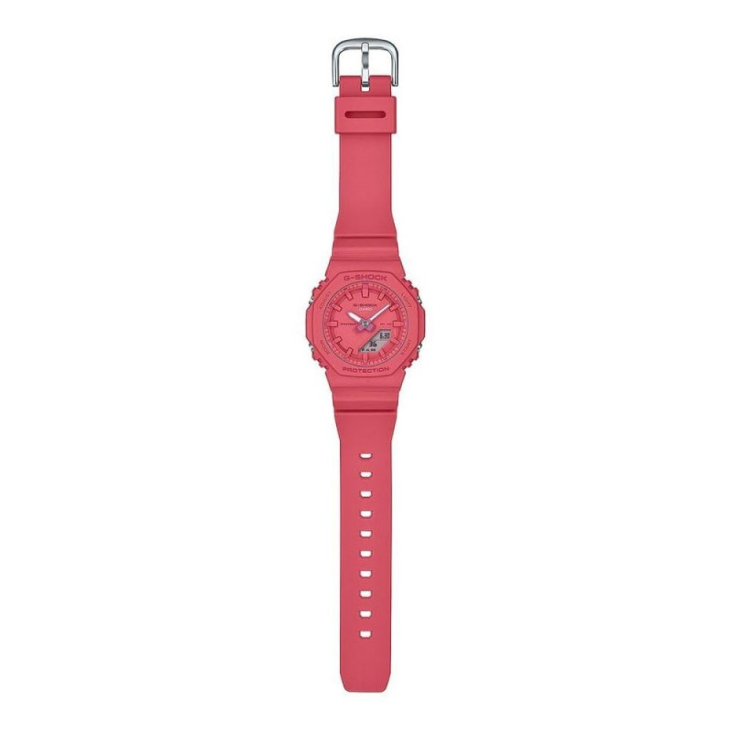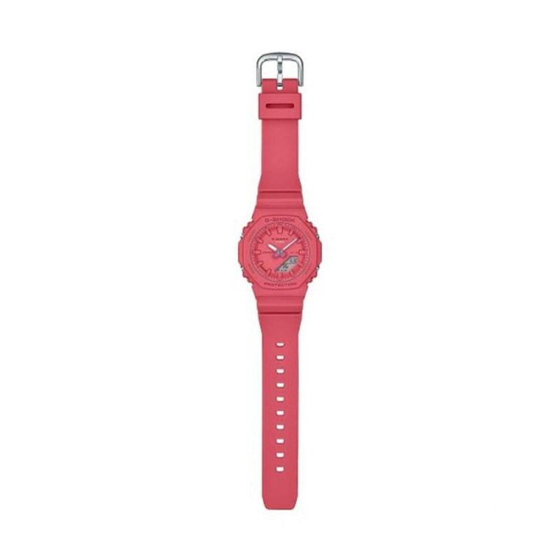 Casio G-Shock OAK COMPACT on naiste käekell, mis ühendab funktsionaalsuse ja stiili moodsas ning naiselikus disainis. Selle eripäraks on roosa värv nii korpuses kui ka resiinist rihmas, mis tagab kerge, vastupidava ja mugava kandmise igapäevaselt. See multifunktsionaalne mudel sisaldab mitmeid praktilisi funktsioone, sobitudes nii igapäevasteks tegevusteks kui ka vabaajaoludesse, kus on vajalik tõhus aja kontroll. Pandlaga kinnitustüüp tagab kindla ja stabiilse sobivuse randmel, kohandudes erinevate suurustega ilma mugavust kaotamata. Kokkuvõttes pakub OAK COMPACT tehniliselt ja esteetiliselt lahendust tänapäeva naise vajadustele, säilitades G-Shocki tuntud vastupidavuse ja usaldusväärsuse, kuid roosa tooniga pehmema ja atraktiivsema välimusega. See kell on tasakaalustatud valik neile, kes hindavad multifunktsionaalset aksessuaari, mille disain on mõeldud naistele ja omadused sobivad mitmekülgseks igapäevaseks kasutuseks.