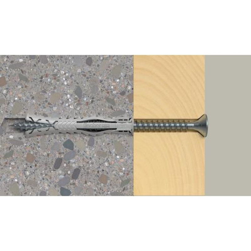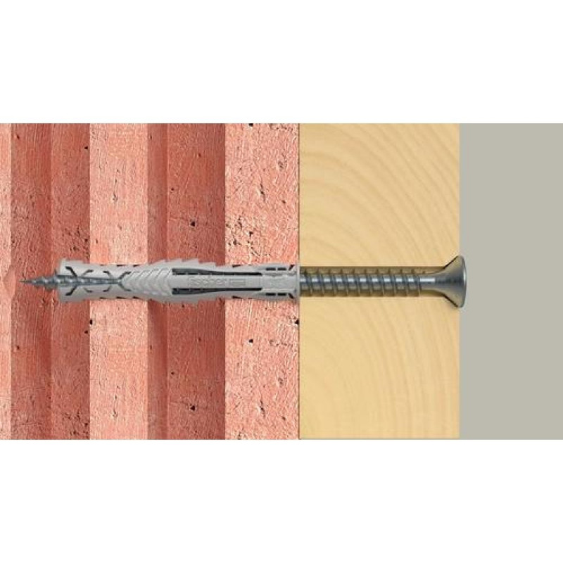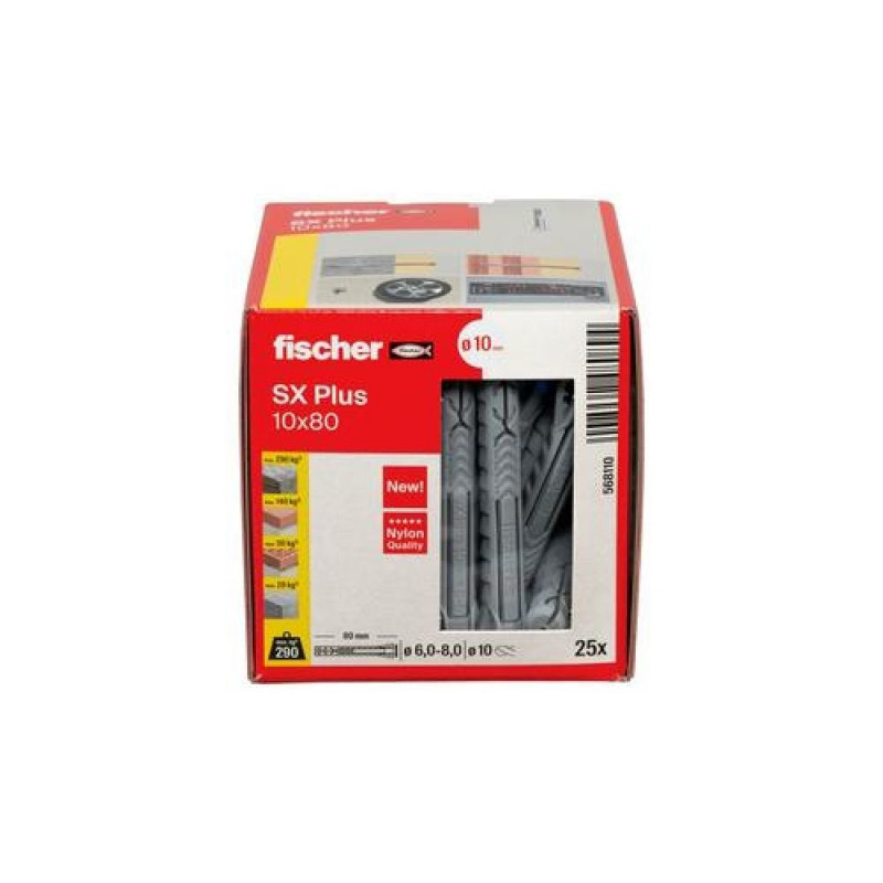 <b>Advantages</b><br>- The 4-way spread ensures optimum force transmission into the building material and guarantees high holding values in solid and perforated building materials.<br>- The special fixing blades ensure pre-fixation of the screw, leaving both of the user's hands free during the setting process.<br>- The expansion-free plug neck prevents the creation of expansion forces on the material surface whilst screwing in the screw. This helps to prevent damage to tiles and plaster.<br>- The special shape of the plug makes it easy to place in the drill hole with just a few hammer blows.<br>- The greater anchorage depth means that the plug is especially suited to fixings in hollow building materials, aerated concrete and to bridge plaster.<br>- Due to the noticeable tightening torque, the user automatically recognizes when the screw is properly installed and thus prevents overtightening of the screw.<br><br>Thanks to its 4-way expansion, the fischer SX Plus expansion plug is the specialist for solid building materials such as concrete, sand-lime brick and masonry. The special fixing blades ensure pre-fixation of the screw, which means that it does not have to be additionally held in place for overhead applications. This screw fixation allows the user a flexible and comfortable setting process. The flexibel plug edge also prevents the plug from slipping deeper into the drill hole for secure installation. The high-quality nylon material guarantees a permanently secure hold in a wide range of solid and perforated building materials. This variant, with larger anchorage depths, is Ideal for fixings in hollow building materials, in aerated concrete and for plaster covering.<br><br><b>Functionality</b><br>- The SX Plus is suitable for pre-positioned and push-through installation.<br>- When the plug is inserted, the fixing wings fold inwards. This locks the screw in place when it is inserted into the plug and prevents it from falling out, which is particularly helpful in overhead applications.<br>- When the screw is tightened, the SX Plus expands in four directions and thus anchors itself securely in the building material.<br>- The anti-rotation lock prevents the plug from twisting and allows for easy installation.<br>- Suitable for wood and chipboard screws, as well as stud screws.<br>- The required screw length is given by the plug length + fixture thickness + the screw diameter.Fischer 568110. Product type: Expansion anchor, Suitable for materials: Autoclaved aerated concrete, Brick, Concrete, Gypsum fibre board, Masonry, Material: Nylon. Diameter: 1 cm, Length: 80 mm, Drill hole diameter: 1 cm. Quantity per pack: 25 pc(s), Package type: Box, Screw anchors included in set: 25 x SX Plus 10 x 80