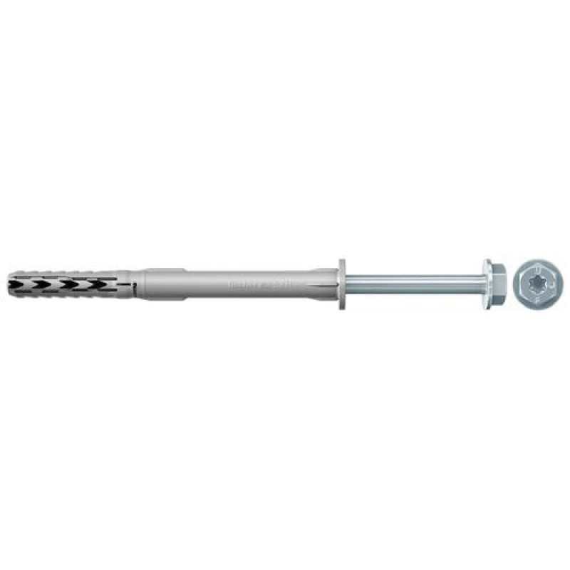 The fischer frame fixing SXR-FUS is a plug made of high-quality nylon along with the fischer hexagonal screw and moulded washer. Due to the special plug geometry, the SXR can be used in solid and hollow building materials. Due to the low anchorage depth of only 50 mm, the frame fixing can be handled in an especially cost-effective manner for multiple fixing of non-load-bearing systems. The fischer frame fixing SXR-FUS is particularly recommended with the hexagonal screw and moulded washer for fixing metal constructions.Fischer 502456. Type: Screw kit, Material: Nylon, Suitable for materials: Concrete. Thread length: 5.2 cm. Quantity per pack: 1 pc(s)