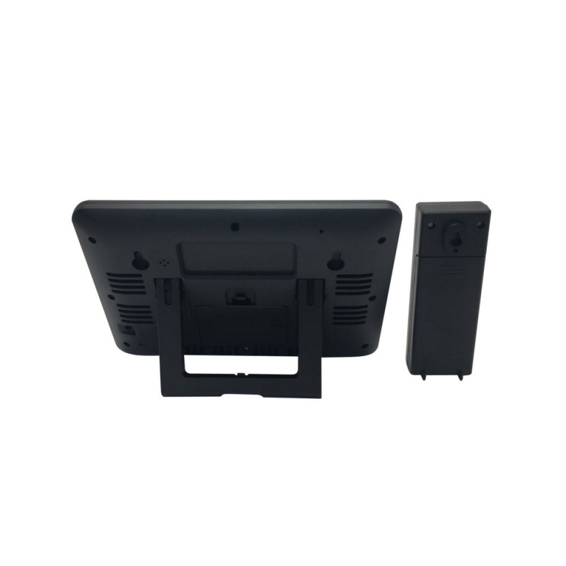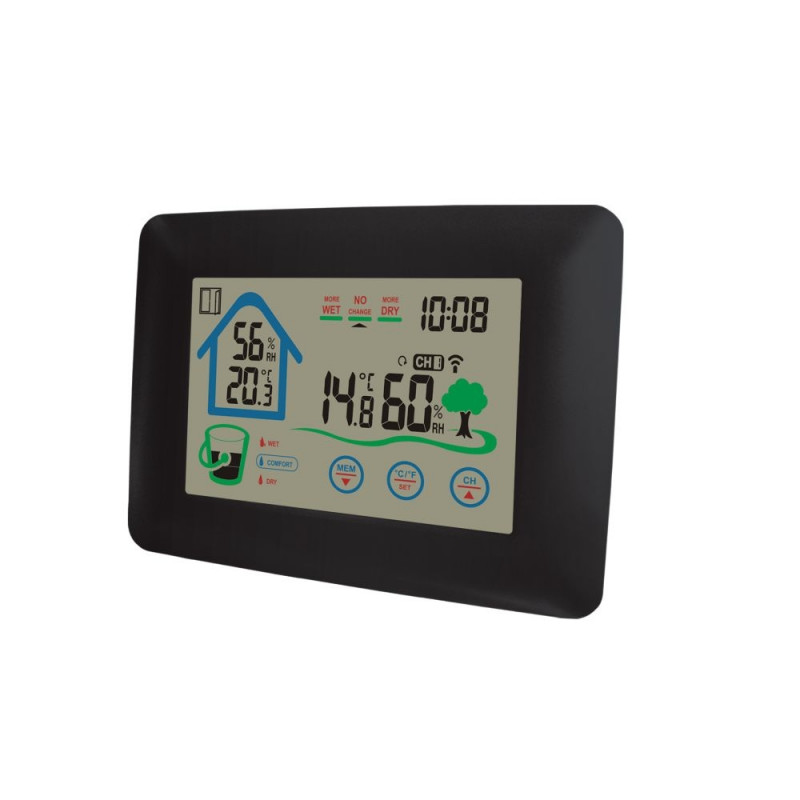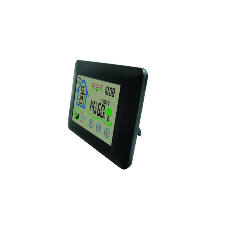 Puutetundlik ilmajaam koos kellaga 3 puutetundliku ekraani klahvi 12/24 tunni valik Celciuse/Fahrenheiti valik Akna avamise/sulgemise indikaator Sisetemperatuur ja niiskus Välistemperatuur ja niiskus Sisse/välja temperatuuri max/min rekordid Siseruumide mugavusindeksi näitaja; välisõhu niiskuse trend Sisetemperatuuri vahemik: 0°C-+50°C Välistemperatuuri vahemik: -40°C-+70°C Sisse/välja õhuniiskuse vahemik: 20%-90% Kuni 3 kanalit Kaasas 1 välisandur Põhiseade töötab 3*AAA patareidega (ei kuulu komplekti) Sensor töötab 2*AA patareidega (ei ole kaasas) Suurus: 17,30 (laius) x 2,20 (s) x 12,50 (k) cm Kaal: 0,36 kg