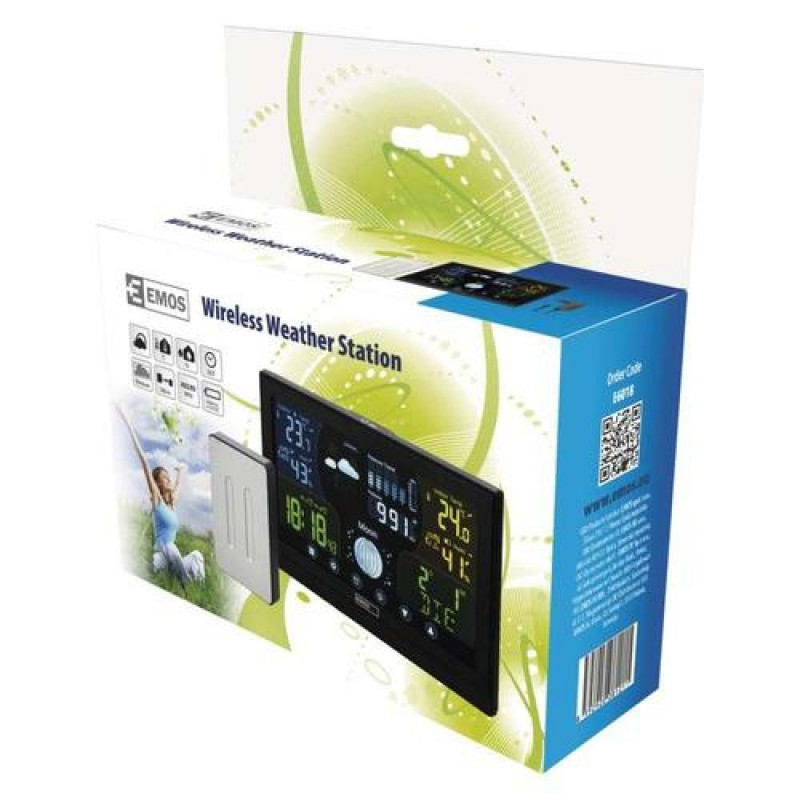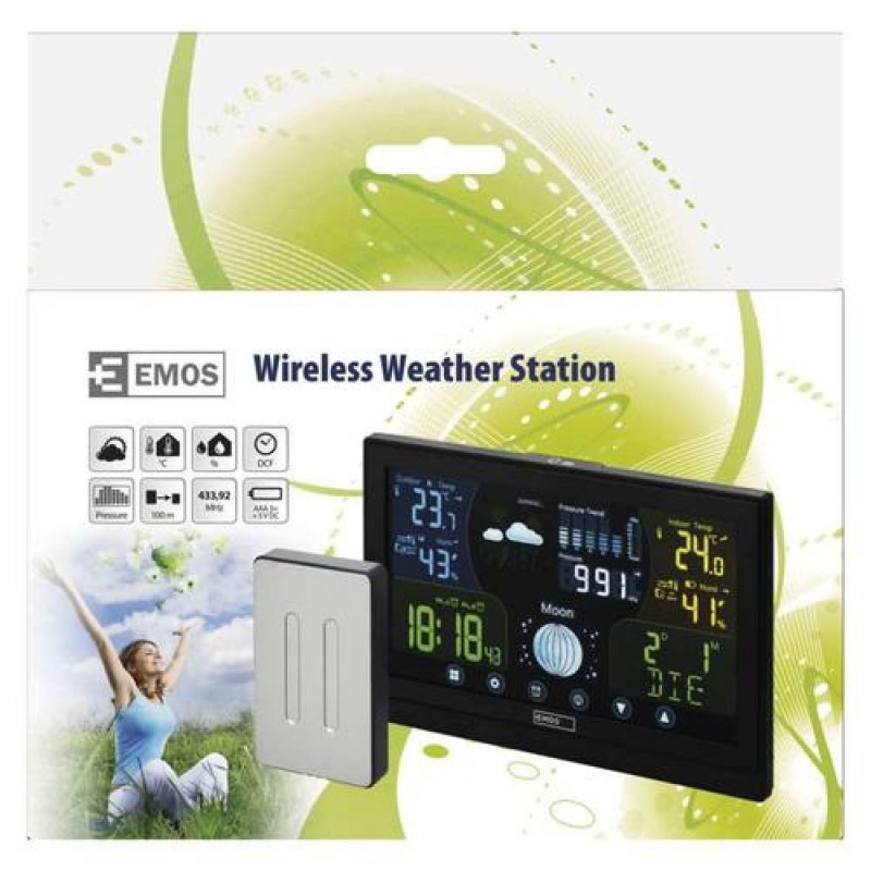 <br />Emos E6018. Product colour: Black, Measuring functions: Indoor barometer, Indoor thermometer, Measuring functions trend display: Barometer, Hygrometer, Thermometer. Display type: LED. Power source: Battery, Battery voltage: 5 V. Width: 192 mm, Depth: 17 mm, Height: 100 mm. Connectivity technology: Wireless