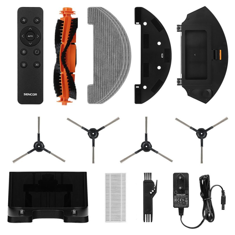 Seadmega on kaasas 4 külgharja, 3 moppi (+ kinnitus), 1 lisa HEPA ja vahtfilter, puhastushari, 2 AAA patareid, laadimisdokk ja pult.