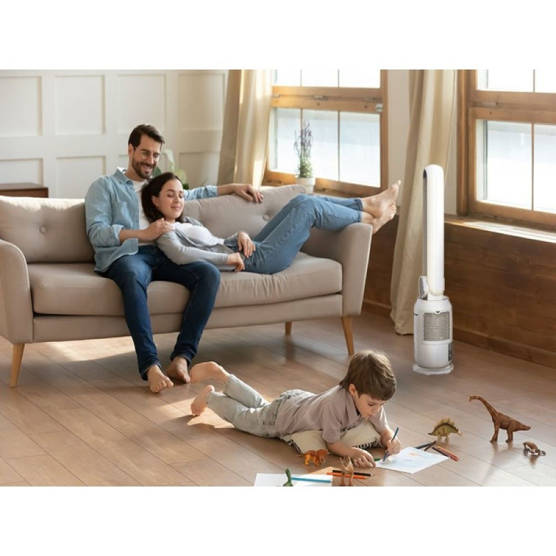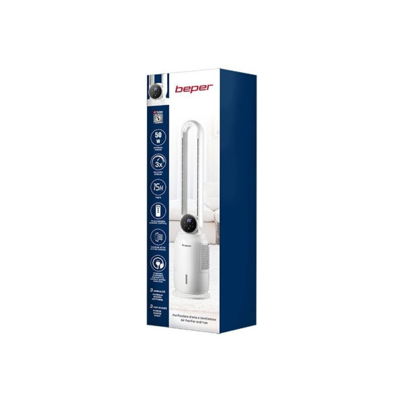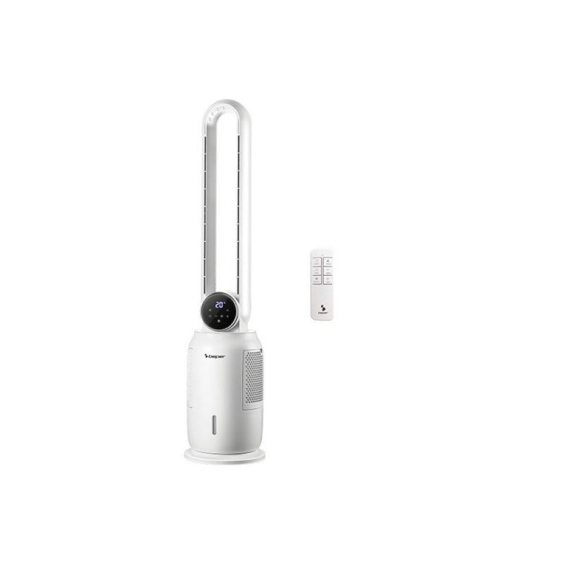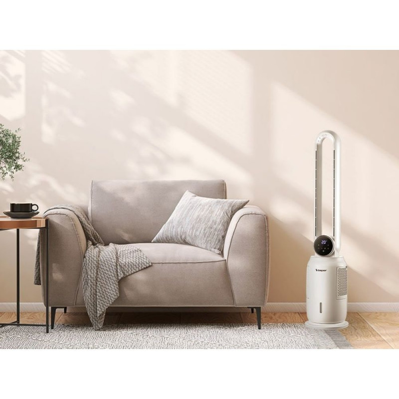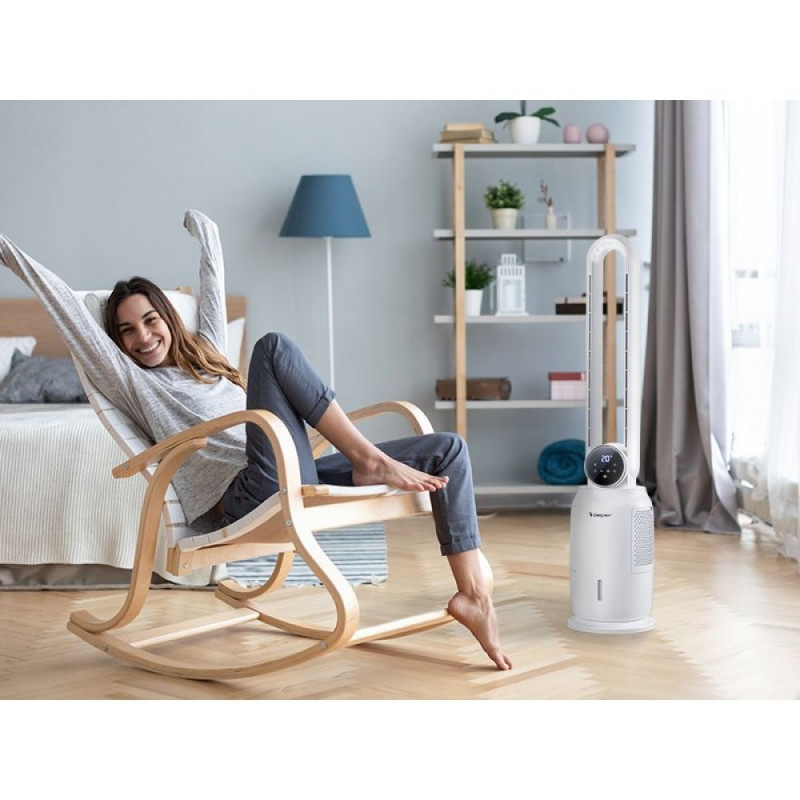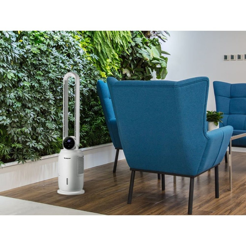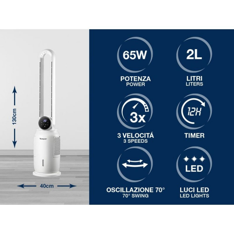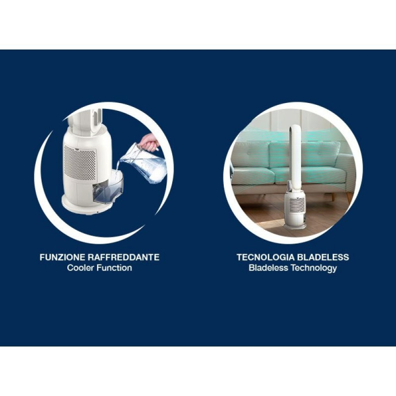 Turret fan with a modern design and innovative bladeless technology for better and more effective airflow distribution. With cooling function thanks to the 2-litre tank, it promotes optimal indoor conditions. 3 selectable speeds and programmable timer up to 12 hours. LED lights on top, touch display and remote control for maximum user comfort.