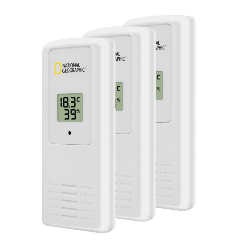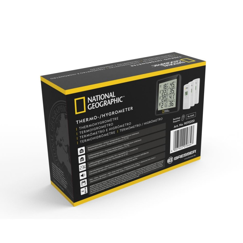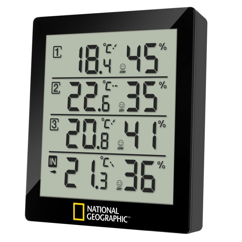 The NATIONAL GEOGRAPHIC thermo-hygrometer offers the possibility to measure temperature and air humidity in or around your house at 4 different locations, with simple monitoring at one location: Is my cellar room too moist and threatened by mould? Is the children's bedroom temperature all well? Is it too hot on the terrace? There are many more options open.
