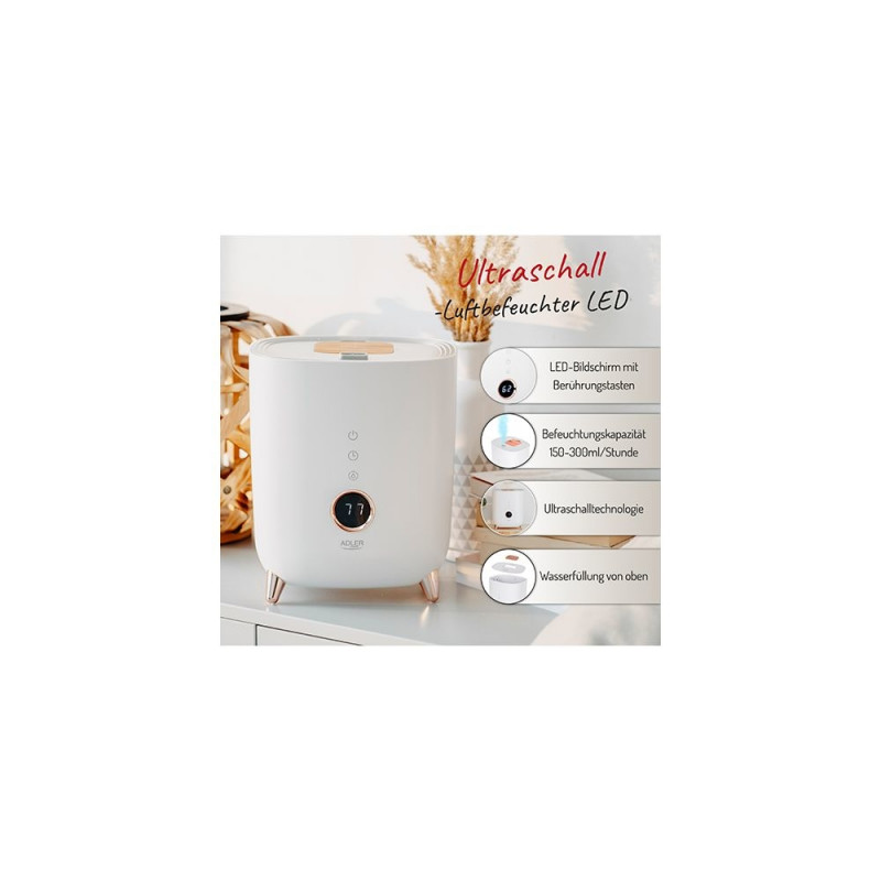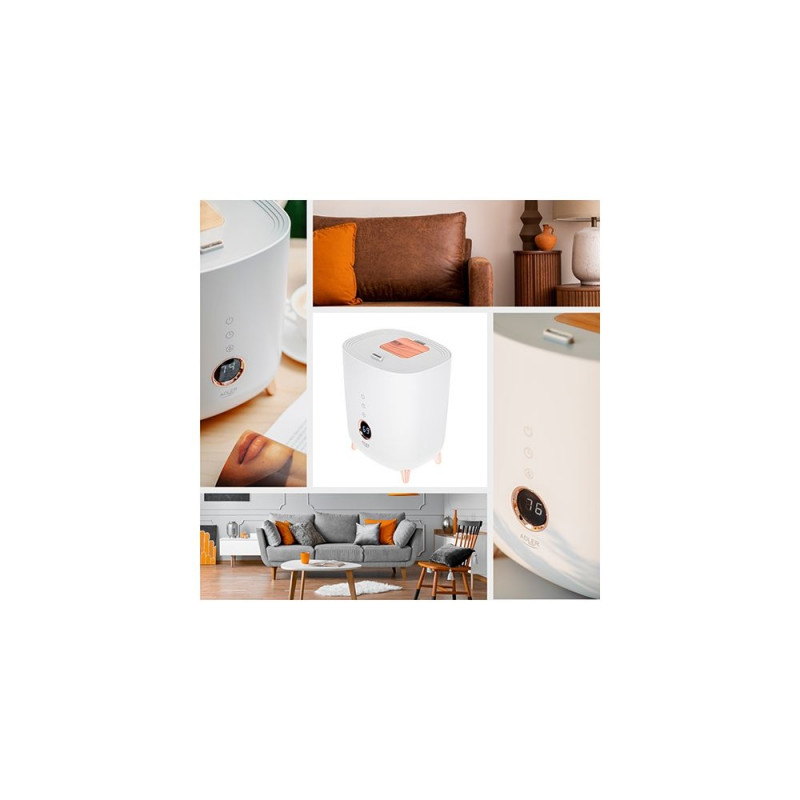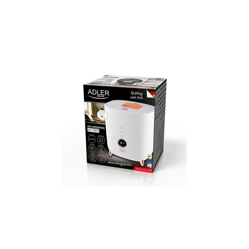 Lisaks on Adler 7972 niisutaja varustatud hügromeetri funktsiooniga, mis täpselt määrab sihtniiskuse vahemikus 40% kuni 90%. Täiustatud veepuuduse andur tagab kasutamise ohutuse, lülitades seadme automaatselt välja, kui veevarud on otsas. Tänu taimerile saad kohandada niisutaja tööaega vastavalt oma vajadustele, valides automaatse väljalülituse 1, 2, 4 või 6 tunni järel. Kolmeastmeline niiskuse intensiivsuse reguleerimine võimaldab kohandada seadme tööd ruumi suuruse ja tingimustega. Suure 4,0-liitrise veepaagi ja ühe täitmisega üle 13 tunni kestva tööajaga tagab seade pikaajalise ja tõhusa niisutamise.