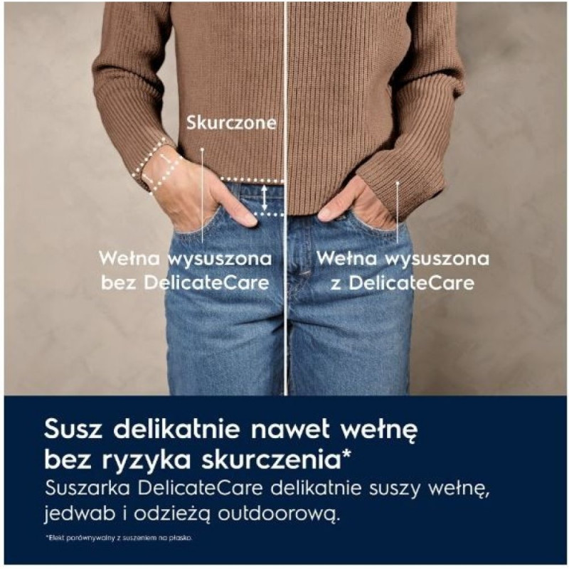 DelicateCare kasutab soojuspumba tehnoloogiat, et kuivatada riideid õrnalt, ning tänu kohandatud trumli liikumisele ja temperatuuridele pikendab see sinu riiete eluiga. Sellised materjalid nagu siid ja vill kuivatatakse samuti ülima hoolikusega. Woolmarki sertifikaadiga.