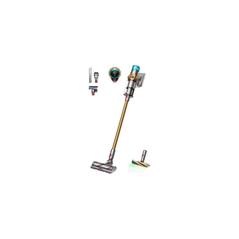 <b>Whole-machine HEPA filtration</b><br>The Dyson V15 Detect Absolute vacuum has an upgraded HEPA post-motor filter to trap even more microscopic particles as small as 0.1 microns.‡ Only available direct from Dyson.<br><br><b>Built-in dusting and crevice tool</b><br>Wand detaches with a click to reveal a ready-to-go Built-in dusting and crevice tool stored inside for on-the-spot cleans.<br><br><b>Dyson illumination reveals invisible dust</b><br>A precisely angled light makes invisible dust visible on hard floors - so you don’t miss a thing.<br><br><b>Counts and measures the size of dust particles⁺⁺</b><br>A piezo sensor continuously sizes and counts dust particles – automatically increasing suction power when needed.<br><br><b>Scientific proof of a deep clean</b><br>The LCD screen shows what’s been sucked up, displaying real-time scientific proof of a deep clean.<br><br><b>Dyson Hyperdymium™ motor</b><br>This Dyson Hyperdymium™ motor spins at up to 125,000rpm to generate powerful suction. <br><br><b>Root Cyclone™ technology</b><br>Dyson's patented cyclones generate centrifugal forces of up to 100,000g, trapping fine dust and dirt in the bin, so your vacuum never loses suction.<br><br><b>Energy-dense battery</b><br>Each Click-in battery provides up to 60 minutes of fade-free power to clean here, there, and everywhere around your home.<br><br><b>Multi-stage filtration</b><br>Dyson’s advanced, whole-machine filtration traps 99.99% of fine dust as small as 0.3 microns.<br><br><b>Carbon fiber filaments</b><br>Black anti-static carbon fiber filaments extract fine dust from hard floors.<br><br><b>De-tangling Digital Motorbar ™ cleaner head</b><br>Powerfully sucks up dust and hair from all floors. Hair removal vanes automatically clear hair from the brush bar.<br><br><b>Intelligently adapts to floor types</b><br>Dyson DLS™ technology inside the Digital Motorbar™ cleaner head monitors brush bar resistance 360 times a second, intelligently adapting power across different floor types.<br><br><b>The power to clean anywhere</b><br>The versatility of Dyson cordless technology makes cleaning your home easier. Powerful cleaning for floors, hard-to-reach places, and mattresses.<br><br><b>Hair screw tool</b><br>Picks up long hair and pet hair. Fast. Anti-tangle conical brush bar spirals hair off and into the bin. Motor-driven cleaning for small spaces.<br><br><b>Gentle on hard floors. Tough on dirt.</b><br>Engineered with soft nylon and anti-static carbon fiber filaments to remove dust from hard floors and narrower gaps. With a low profile to reach further under furniture.<br><br><b>The right cleaning mode for the right task</b><br>Three cleaning modes optimized for a variety of tasks. The right balance of power and run time where you need it.<br><br><b>Intelligently reports in real time</b><br>Digital display shows run-time countdown to the second and displays maintenance alerts, giving you complete control of your clean.<br><br><b>Tough, durable materials</b><br>Made from strong materials selected for their durability and lightweight properties.Dyson V15 Detect Absolute. Product type: 2-in-1 stick vacuum, Dust container type: Bagless, Product colour: Gold. Cleaning type: Dry, Vacuum air filtering: HEPA, Dirt separating method: Cyclonic. Power source: Battery, Runtime: 60 min, Charging time: 4.5 h. Width: 250 mm, Depth: 266 mm, Height: 1260 mm. Vacuum brushes included: Brush with LED lights, Motorized brush, Multifunctional brush