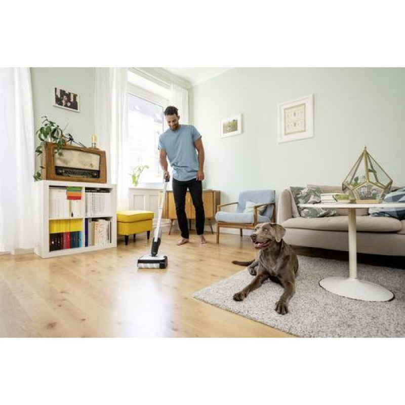 The FC 2-4 floor cleaner impresses with its self-standing design, a low weight of just 2.2 kilograms and automatic switching on and off. To do this, pull the handle of the cleaner backwards to start and remove dry and wet everyday dirt conveniently in just one step. The maximum battery run time per battery charge is 20 minutes, which corresponds to a cleaning area of 70 square metres. After the device is activated, the roller is automatically moistened with the water from the fresh water tank. This ensures even and effective cleaning of hard floors. It also cleans right up to the edge and picks up hairs easily thanks to integrated hair filters. The integrated, hygienic dirty water tank also means contact with dirt is avoided. This can be removed and cleaned directly after using the device. The included 4 V Kärcher Battery Power exchangeable battery is compatible with all 4 V Kärcher Battery Power devices.Kärcher FC 2-4. Product type: Electric broom, Dust container type: Bagless, Product colour: Black, Grey, White. Cleaning type: Dry&wet, Cleaning surfaces: Hard floor, Area cleaned per battery charge: 70 m². Power source: Battery, AC input voltage: 100 - 240 V, AC input frequency: 50 - 60 Hz. Package weight: 4.3 kg, Quantity per pack: 1 pc(s). Width: 240 mm, Depth: 220 mm, Height: 1200 mm
