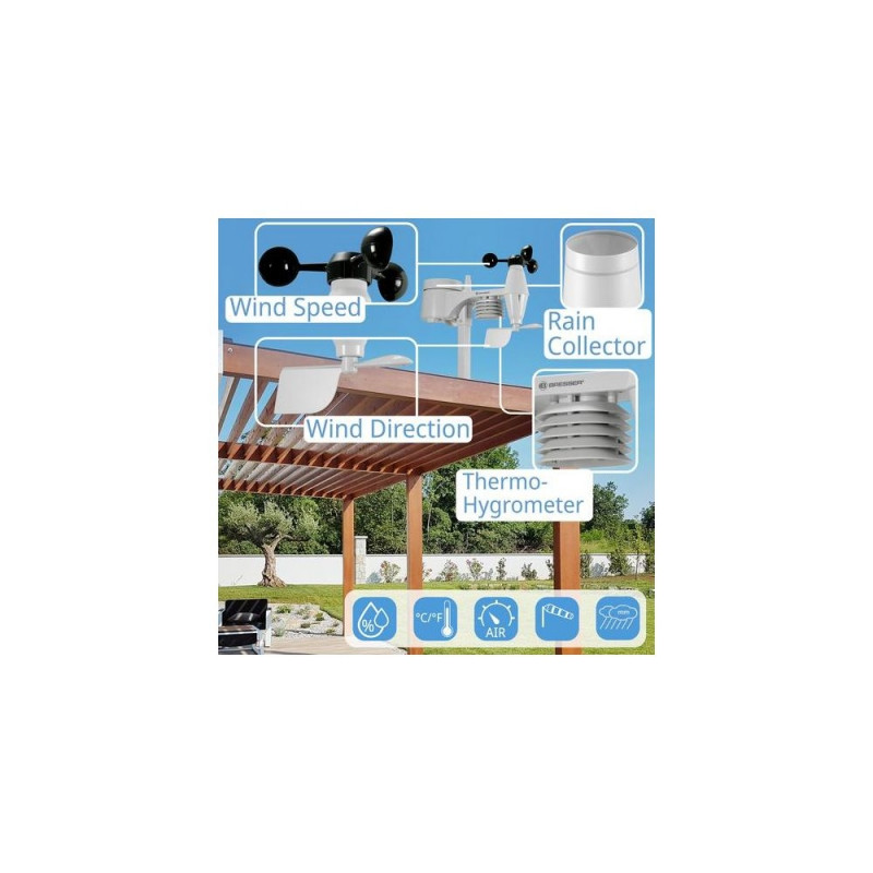 <b>With this WLAN weather station you can read the local data of your weather station, such as the very reliable weather trend forecast, and publish it on apps.</b><br><br>Bresser Optics 7002580. Product colour: Black, Measuring functions: Anemometer (wind speed), Indoor hygrometer, Indoor thermometer, Outdoor barometer, Outdoor..., Measuring functions trend display: Barometer, Hygrometer, Rainfall, Thermometer. Display diagonal: 14.5 cm (5.7"). Power source: AC. Receiver dimensions (WxDxH): 168 x 143 x 24 mm, Transmitter dimensions (WxDxH): 343 x 493 x 136 mm. Connectivity technology: Wireless