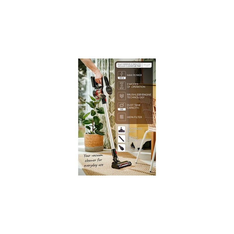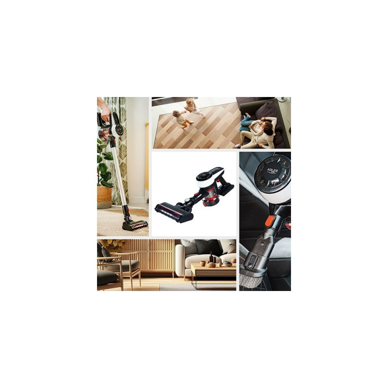 ADLER AD 7048 varstolmuimeja on professionaalne, suure jõudlusega seade, mis sobib ideaalselt mitmete ruumide ja auto sisemuse mugavaks puhastamiseks. Kvaliteetne tolmukotita tolmuimeja leiab rakendust igas kodus. Juhtmevaba konstruktsioon võimaldab puhastada kogu korteri või kontori ilma pistikupesasid otsimata. Mugav käepide ja seadme väike kaal muudavad liikumise puhastatavate ruumide vahel lihtsaks. Tänu seadmega kaasas olevale seinakinnitusele ei pea Sa muretsema põrandate kriimustamise või tolmuimeja hoiustamiseks vajaliku ruumi puudumise pärast! Seade on varustatud ka TURBO-funktsiooniga, mis aitab eemaldada tolmu vaipadelt ja polstrilt, ning Dual Cyclone topeltfiltreerimistehnoloogiaga. Sisseehitatud valguse abil leiad üles isegi kõige väiksemad mustuseosakesed. Seadmel on LED-ekraan, mis näitab aku laetuse taset.