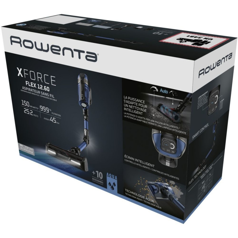 Rowenta X-Force Flex 12.60 Aqua on varustatud Aqua-mop süsteemiga, mis võimaldab samaaegselt tolmu imeda ja põrandaid pesta. Komplektis olevad mikrokiudlapid tagavad tõhusa märgpuhastuse ning eemaldavad ka kuivanud plekid. Seadme LED-valgustusega otsik aitab näha tolmu ja mustust ka hämarates nurkades. Lisaks on tolmuimejal praktiline digitaalne ekraan, mis kuvab aku laetuse taset ja valitud töörežiimi.