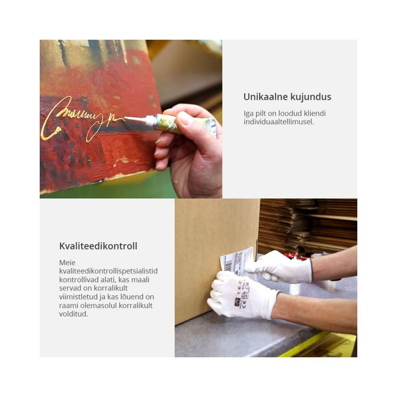 Käsitsi maalitud pilt luuakse professionaalsele itaalia lõuendile. Lõuend krunditakse enne maalimist ja venitatakse puitraamile. Maalimiseks kasutatakse kõrgeima kvaliteediga akrüülvärve.