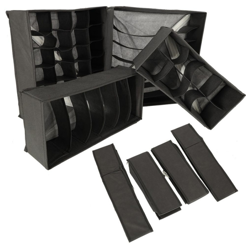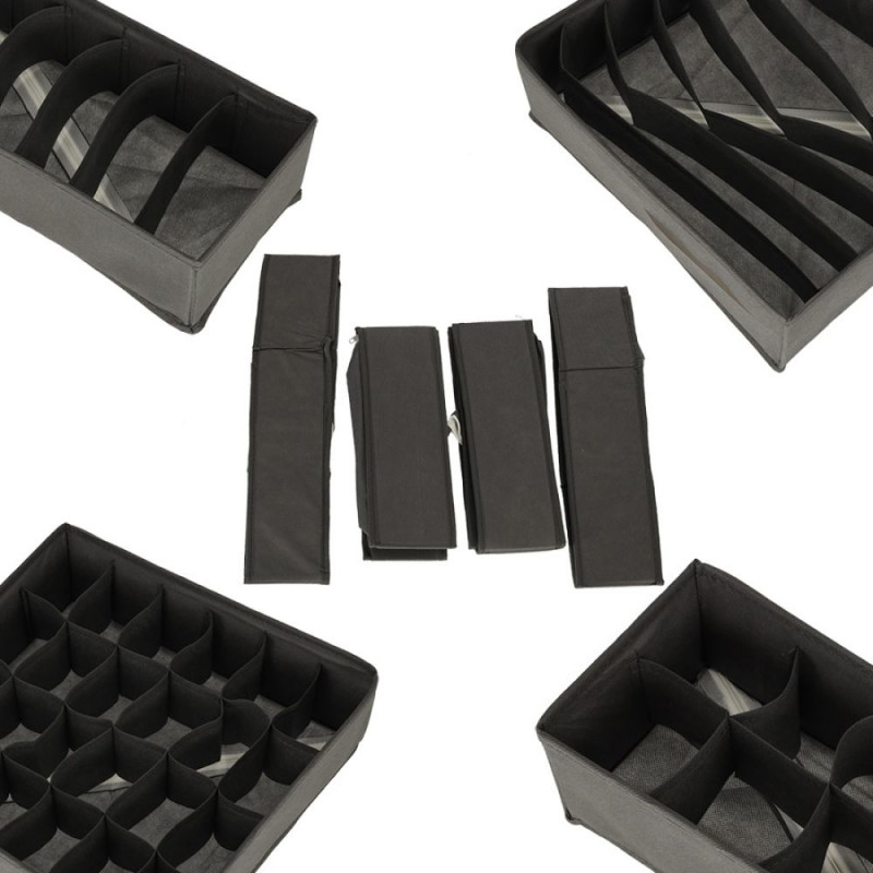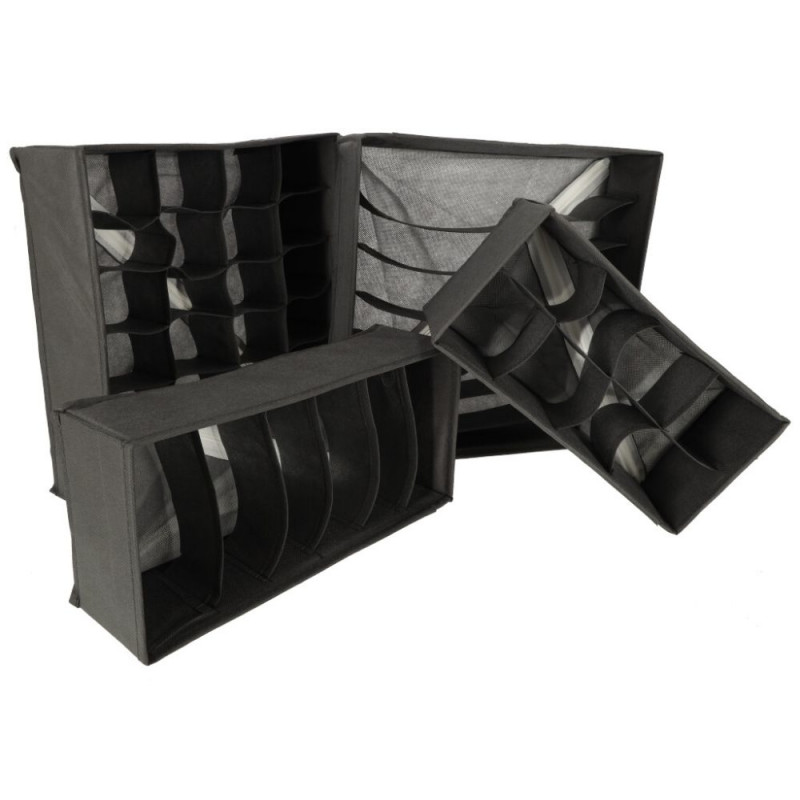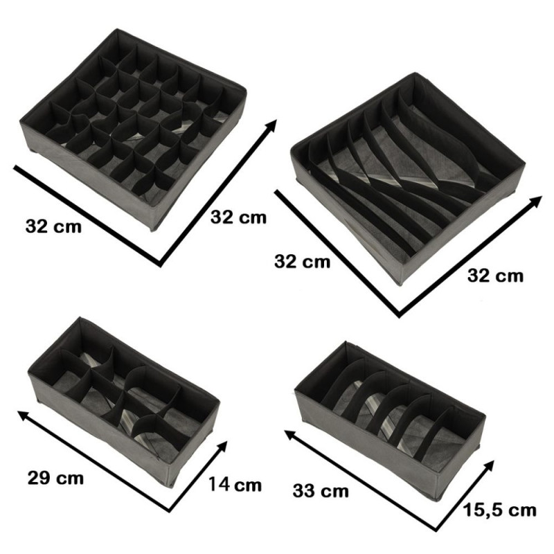 Nelja praktilise aluspesu korraldaja komplekt. Need hoiavad teie sahtlid korras. Iga konteinerit saab kasutada erinevat tüüpi aksessuaaride - sokid, lipsud, ujumisriided - jaoks. Värv: hall. Suur konteiner: 32 cm x 32 cm x 10 cm.Osta kohe, viimased eksemplarid laos!