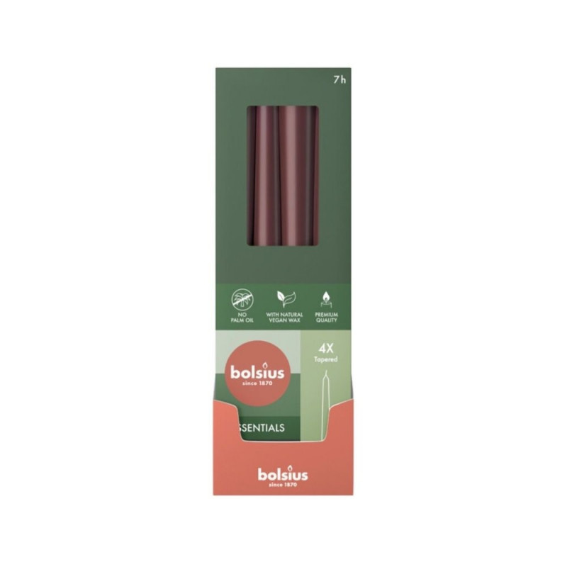 Bolsius Table Candles in dark red come as a set of four classic dinner candles measuring 245 mm in height and 24 mm in diameter, with a burn time of about 7–7.5 hours, offering a steady, clean flame, fitting standard candle holders and adding warmth and charm to both everyday meals and festive table settings.