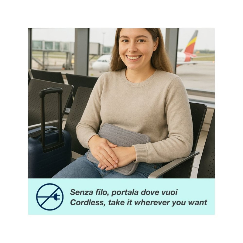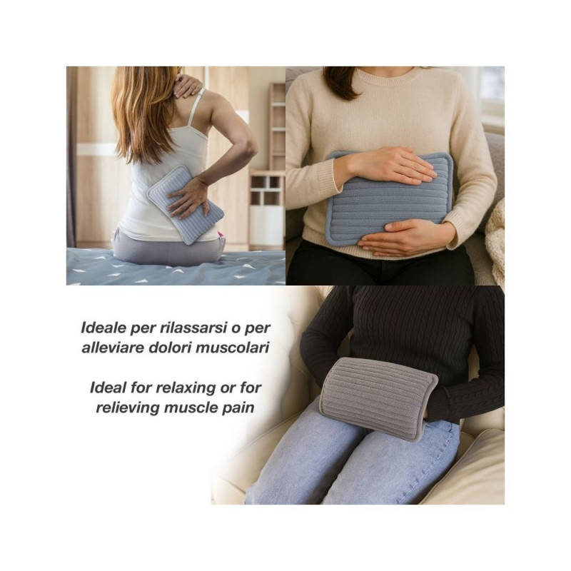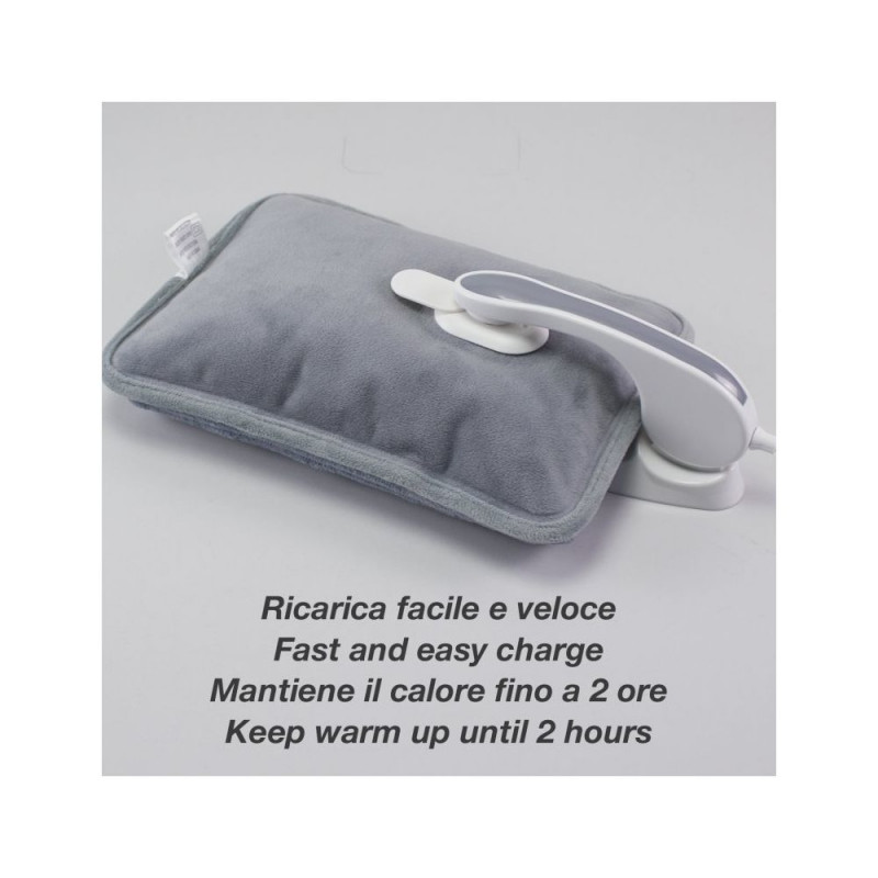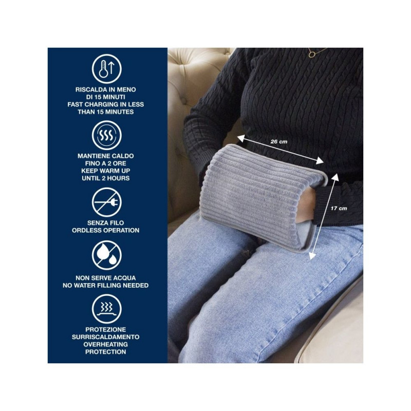 Elektriline kuumaveepudel pehme polüestervoodri ja mugavate käetaskutega. Ideaalne külmadeks talvepäevadeks või kiireks leevenduseks lokaalse lihasvalu ja -pinge korral. Mugav ja hõlpsasti kasutatav, saavutab maksimaalse töötemperatuuri (umbes 50 °C) vähem kui 15 minutiga ja hoiab soojust kuni 2 tundi. Ohutu kasutada: ei vaja veega täitmist ja on varustatud ülekuumenemiskaitsega.