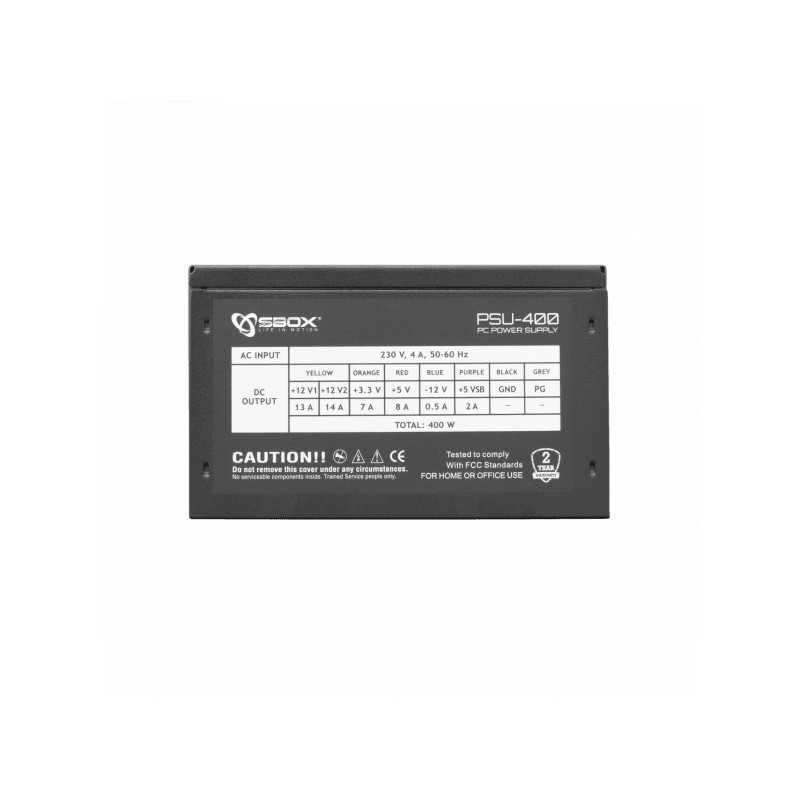 Tehnilised detailid Tüüp: toiteallikas Väljundvõimsus (mW): 400 W Ventilaatori mõõdud (mm): 120x120 Mõõdud (mm): 140x149,5x85 Materjal: Metall Värv: must Pistikud: 24 x 1 (MBO), 4//8 x 1 (CPU), SATA x 4 (HDD/SSD), MOLEX x 2 (FAN), PCI-E 6/8 x 1 (GPU) PSU kaablite pikkus (cm): 50-55 Voolu 12V / 5V / 3,3V: kollane (+12V1 / 13A), kollane (+12V1 / 14A), oranž (+3,3V / 7A), punane (+5V / 8A), sinine (-12V / 0,5A) ), lilla (+5VSB / 2A), must (GND), hall (PG)