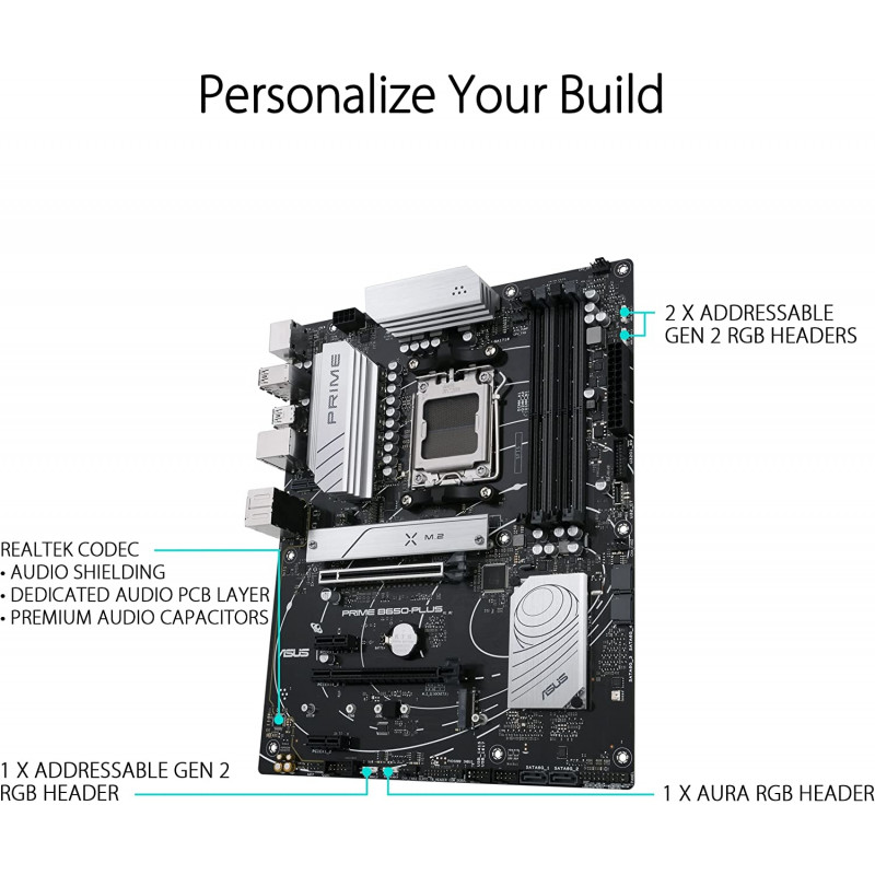 Aura Sync: PRIME B650-PLUS toetab ASUS Aura Sync RGB valgustust, mis võimaldab teil oma süsteemi isikupärastada ja luua ainulaadse välimuse.