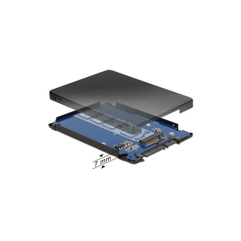 This Delock converter enables the connection of a M.2 NGFF SSD in 2280, 2260, 2242 and 2230 format. It can be used as a replacement for a 2.5″ HDD. The converter will be installed into the system internally through a SATA 22 pin interface.DeLOCK 62688. Product colour: Black. Supported storage drive heights: 1.35 mm. Width: 70 mm, Depth: 100 mm, Height: 7 mm