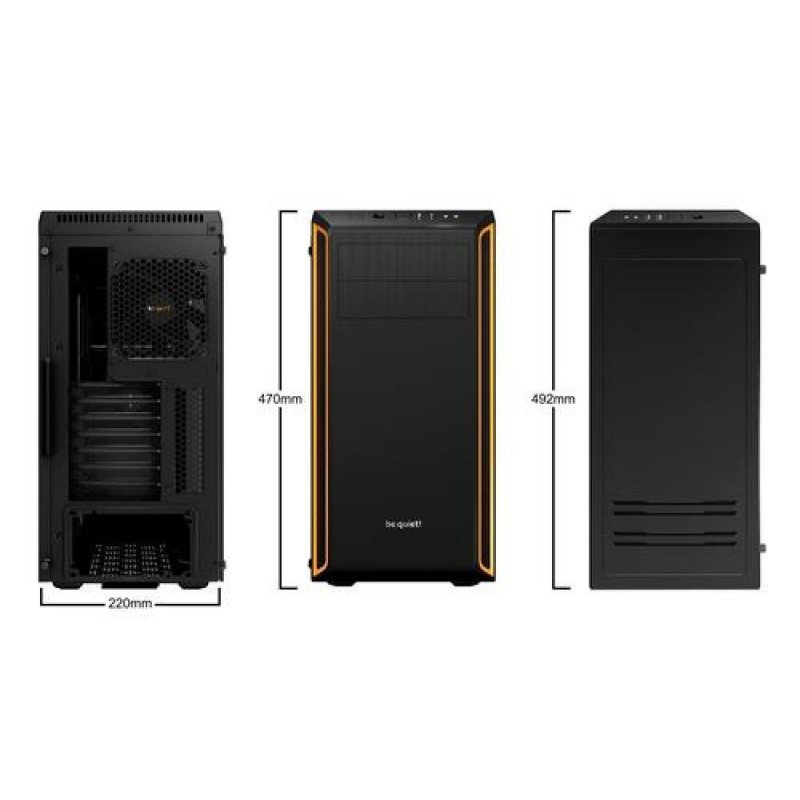 <b>Exceptionally silent and functional</b><br><br>Pure Base 600 Window is truly multi-talented, offering a great deal of functionality and features for an attractive price. Smart usability features and whisper-quiet operation enable you to realize almost any system configuration you desire for your ATX or micro ATX PC. It is the perfect base for your system.<br><br><b>HIGHLY VERSATILE CONSTRUCTION</b><br><b>Maximum of possibilities for your desired system</b><br>Pure Base 600 offers many possibilities for system component selection. The 3 HDD slots can be repositioned to allow installation of the largest of graphics cards and the ODD cage is removable for maximum flexibility of water cooling and drives.<br><br><b>OPTIMIZED FOR RADIATORS</b><br>Full choice for water cooling<br>Pure Base 600 was optimized to be the perfect case for liquid cooling. 3 areas are specially designed to allow them to be added: front, top and rear. All sizes of radiator up to 360mm are possible.<br><br><b>ADJUSTABLE TOP COVER VENT</b><br>Ingenious concept for water cooling and silence<br>The Pure Base 600 top cover is adjustable allowing choice between boosting your system’s cooling or silence. You can close it for more silence, open it partially for more exhaust or leave it open to mount a water cooling radiator.<br><br><b>PRE-INSTALLED PURE WINGS 2 FANS</b><br>Whisper-quiet operation – typical for be quiet!<br>2 pre-installed Pure Wings 2 fans with 9 airflow-optimized fan blades reduce turbulence and increase air pressure: 120mm at the rear, 140mm at the front. Permits up to four additional cooling fans.<br><br><b>KEEP THE SYSTEM SUPER SILENT</b><br>Equipped with smart and effective silence features<br>Integrated 3-step fan controller supports 3 fans. Sound insulating material on top, side and front that dampens vibration. Filters at front and bottom prevent the dust to come into the case.<br><br><b>TEMPERED GLASS WINDOW</b><br>See your valuable components<br>The high-quality and fully-windowed side panel offers a perfect view of components inside your chassis. The window is made of 4mm tinted and tempered glass, and is decoupled from the case with rubber elements to inhibit the transfer of vibrations.<br>be quiet! Pure Base 600 Window. Form factor: Midi Tower, Type: PC, Product colour: Black, Orange. Power supply location: Bottom, Supported power supply form factors: ATX. Front fans installed: 1x 140 mm, Front fans diameters supported: 120,140 mm, Rear fans installed: 1x 120 mm. Supported HDD sizes: 2.5,3.5". Width: 220 mm, Depth: 492 mm, Height: 470 mm