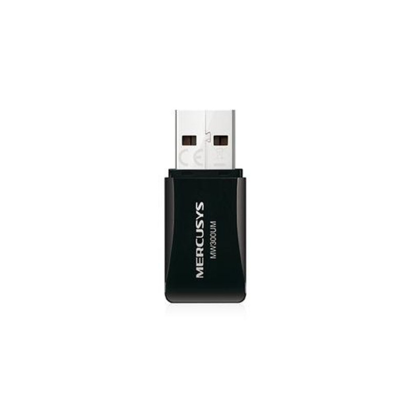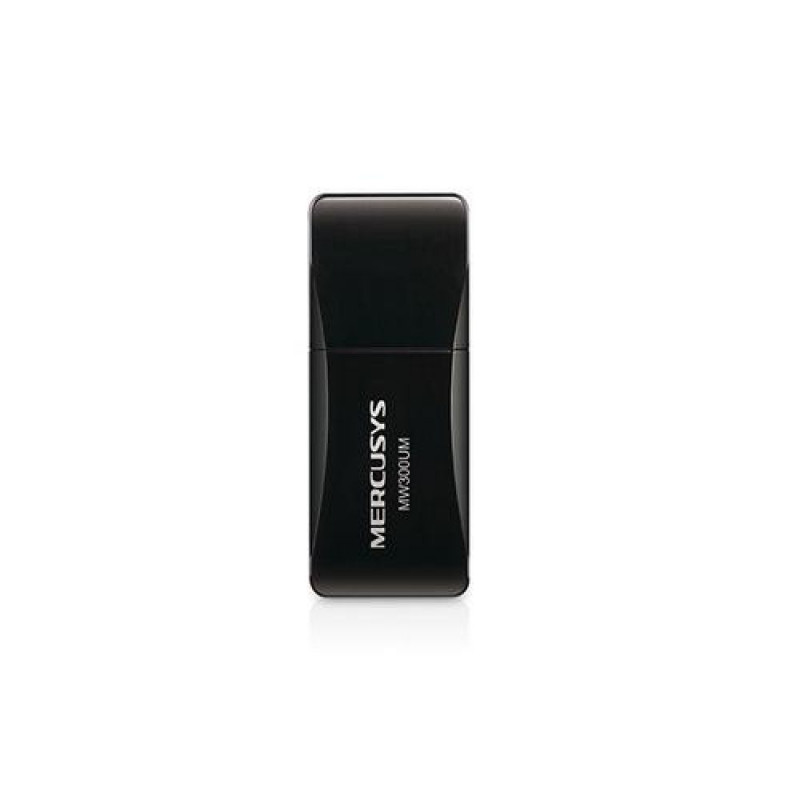 Get Connected, Get Fast.<br>N300 Wireless Mini USB Adapter<br><br>Diverse Functions for Most Needs<br>The MW300UM Wireless Mini USB Adapter allows you to connect a PC or laptop to a wireless network of up to 300Mbps speeds. Moreover, with its soft AP function, it could turn your PC or laptop into a Wi-Fi hotspot if you are using an existing wired connection. That would satisfied your most surfing needs.<br><br>Portable Design for More Convenience<br>The MW300UM could be inserted into any USB port, which adapts to any applying scenarios. Besides, it takes the advantage of portable design, making it quite convenient to take on the road.Mercusys N300 Wireless Mini USB Adapter. Connectivity technology: Wireless, Host interface: USB, Interface: USB. Maximum data transfer rate: 300 Mbit/s, Top Wi-Fi standard: Wi-Fi 4 (802.11n), Wi-Fi band: Single-band (2.4 GHz). Product colour: Black