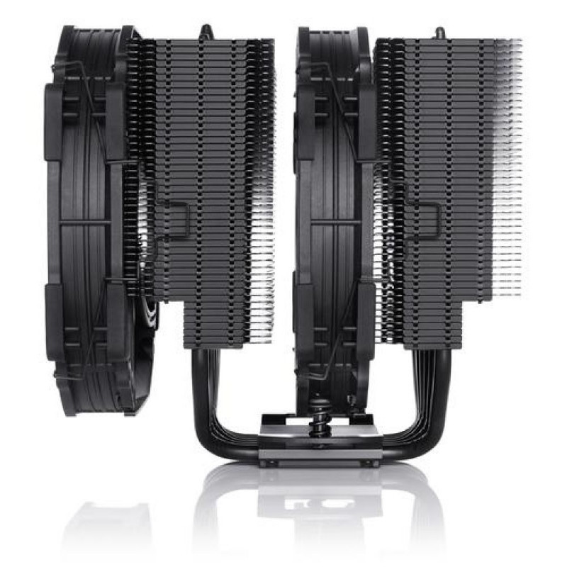 The NH-D15 chromax.black is an all-black version of Noctua’s award-winning flagship model NH-D15 premium-quality quiet CPU cooler. Thanks to the same proven dual-tower heatsink design and NF-A15 PWM fans, it stays true to the NH-D15’s successful formula of rivalling the performance of all-in-one water coolers while maintaining superb quietness of operation. At the same time, the chromax.black version with its black fans and black coated heatsink combines these assets with a sleek stealth look. Topped off with the renowned SecuFirm2™ multi-socket mounting system, Noctua’s enthusiast-grade NT-H1 thermal compound and a full 6-year manufacturer’s warranty, the NH-D15 chromax.black is a deluxe choice for both overclockers and silent enthusiasts who seek an elite-class heatsink that looks just as great as it cools.<br><br>Award-winning NH-D15 cooler<br>Tens of thousands of enthusiast users all over the world swear by the NH-D15’s quality and performance. Recommended by more than 200 international hardware websites and magazines, it is renowned for being one of the best high-end coolers on the market.<br><br>chromax.black design<br>The NH-D15 chromax.black is black from head to toe: Featuring a black coated heatsink, black fans with black anti-vibration-pads, black fan clips and black mounting parts, it’s right at home in all-black builds and easy to integrate with other colour schemes.<br><br>Colour-customisable<br>Using the optional NA-HC3 and NA-HC4 heatsink covers as well as the NA-SAVP3 anti-vibration pads (available in black, blue, green, red, yellow, white), the NH-D15 chromax.black can be fully customised to fit popular build colour schemes such as black and red or black and white.<br><br>6 heatpipe dual tower design<br>As compared to conventional single tower heatinks, the NH-D15's fine-tuned six heatpipe dual tower design provides more surface area, better heat-distribution and superior airflow efficiency in dual fan mode.<br><br>Widened fin stack and expanded heatpipe layout<br>Compared to the NH-D14, the NH-D15's fin-stack has been widened from 140 to 150mm and its heatpipes are now spaced further apart, which allows for a more uniform heat distribution over a larger surface area and thus contributes to the NH-D15's superior efficiency.<br><br>High RAM compatibility in single fan mode<br>Thanks to its recessed lower fins, the NH-D15 provides 64mm clearance for tall memory heatsinks in single fan mode, making it compatible with most high end RAM modules on the market. In dual fan mode, the NH-D15 should be used with standard height RAM (up to 32mm).<br><br>Dual NF-A15 140mm fans<br>The NH-D15 features two of Noctua's premium class NF-A15 140mm fans. Complying with Noctua's AAO standard and featuring sophisticated aerodynamic design measures such as Flow Acceleration Channels, the NF-A15 has quickly built up a reputation as one of the best 140mm fans on the market.<br><br>PWM support and Low-Noise Adaptors<br>The NF-A15 premium fans supplied with the NH-D15 support PWM for convenient automatic speed control through the motherboard. In addition, the maximum fan speed can be reduced from 1500 to 1200rpm using the supplied Low-Noise Adaptors for even quieter operation.<br><br>Excellent component cooling<br>Extending below the fin-stacks, the large NF-A15 fans not only contribute to the NH-D15's superb CPU cooling capabilities but also provide massive airflow over surrounding motherboard components and heatsinks, thus ensuring excellent component cooling performance.<br><br>SecuFirm2™ multi-socket mounting system<br>Noctua’s SecuFirm2™ mounting systems have become synonymous with quality, safety and easy installation. Supporting Intel LGA115x (LGA1150, LGA1151, LGA1155, LGA1156) and LGA20xx (LGA2066, LGA2011-0, LGA2011-3), as well as AMD AM4, AM3(+), AM2(+), FM2(+) and FM1, the SecuFirm2™ mounting included with the NH-U12S is straightforward to install, provides perfect contact pressure and will stand the test of time even under heavy use.<br><br>Compatibility with past and future sockets<br>Thanks to Noctua’s SecuFirm™ ecosystem, the NH-D15 can be made compatible with the older LGA1366 and LGA775 sockets using the optional NM-I3 mounting kit, which is provided free of charge. If technically possible, Noctua will also provide upgrade kits for future sockets, which makes the NH-D15 a safe long-term investment.<br><br>NT-H1 thermal compound<br>Noctua’s much-acclaimed NT-H1 is a pro-grade TIM solution that provides minimum thermal resistance, excellent ease of use and outstanding reliability. Chosen again and again by overclockers and enthusiast users worldwide, it has established itself as a benchmark for premium-quality thermal compounds.<br><br>Soldered interface between heatpipes and fins<br>With many heatsinks, the fins are press-fitted to the heatpipes. Due to the different thermal expansion coefficients of copper and aluminium, this fit can loosen over years of thermal cycling, which may lead to reduced performance. By contrast, the NH-D15’s fins are soldered to the heatpipes in order to guarantee a superior thermal interface that doesn’t deteriorate even after many years of usage.Noctua NH-D15 chromax.black. Type: Cooler, Fan diameter: 15 cm, Rotational speed (min): 300 RPM, Rotational speed (max): 1500 RPM, Noise level (high speed): 24.6 dB, Airflow: 140.2 m³/h, Maximum air pressure: 2.08 mmH2O, Bearing type: Self-Stabilising Oil-pressure Bearing (SSO). Width: 150 mm, Depth: 161 mm, Height: 165 mm. Product colour: Black