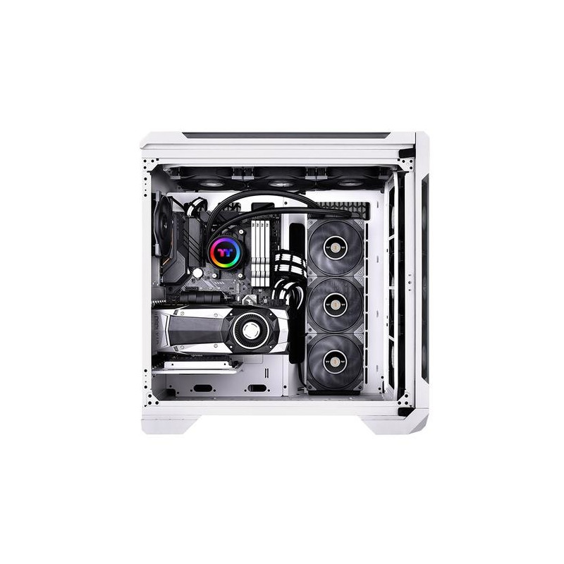 <b>TOUGHLIQUID 360 ARGB Sync</b>TOUGHLIQUID 360 ARGB Sync is an all-in-one liquid cooler that supports 5V RGB compatible motherboards, allowing users to control lighting effects with their motherboard’s software.<b>Rotational Cap</b>TOUGHLIQUID 360 ARGB features a rotational cap that allows users to rotate the cap easily even after installation, so the TT logo faces the right direction to present the overall aesthetic of the build.<b>Switch Lighting Effects</b>The mirror-finished water block is designed with a built-in controller, which grants easy control of the water block’s lighting mode, speed, and color, creating effortless cable management while enjoying the lighting effects with direct access.<b>TOUGHFAN 12 Equipped</b>Equipped with three TOUGHFAN 12, the TOUGHLIQUID 360 ARGB Sync now provides a fan speed of up to 2000 RPM, ensuring best cooling results.<b>High Performance Waterblock</b>The high performance copper base plate accelerates heat conductivity. The high quality and reliable pump enables maximum water circulation, keeping the copper plate continuously cool. The low evaporation tube effectively decreases the loss of coolant; therefore no refill is required.<b>Universal Compatibility</b>TOUGHLIQUID 360 ARGB Sync All-In-One Water block supports Intel and AMD universal brackets, allowing different CPU users to enjoy fantastic lighting effects after a quick installation.Thermaltake Toughliquid 360 ARGB. Type: All-in-one liquid cooler, Maximum airflow: 58.35 cfm, Maximum air pressure: 2.41 mmH2O. Product colour: Black