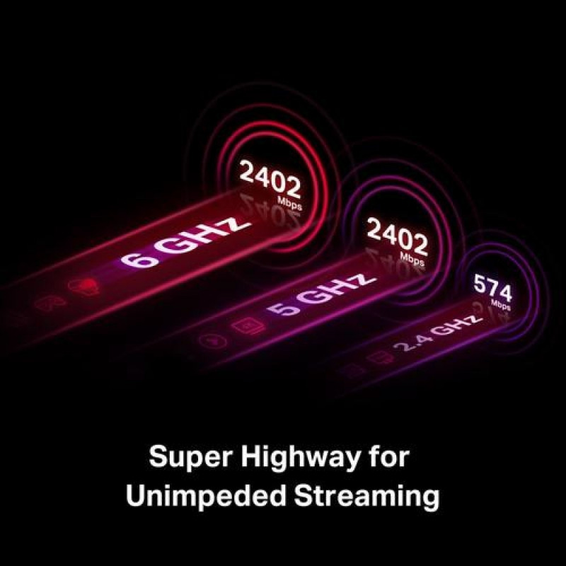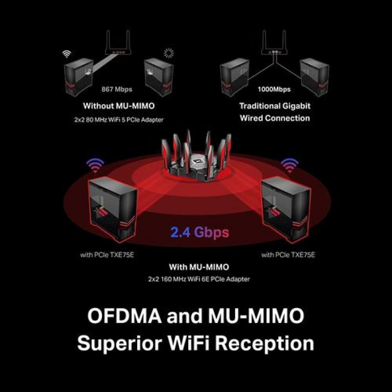 <b>CONNECT YOUR PC<br>TO THE NEW FRONTIER</b><br>AXE5400 Wi-Fi 6E Bluetooth 5.2 PCIe Adapter<br><br><b>Upgrade Your WiFi to 6E</b><br>WiFi 6E means WiFi 6 extended to the 6 GHz band, a newly-opened frequency band that adds more bandwidth, faster speeds, and lower<br>latency. This opens up resources for future innovations in AR/VR, 8K streaming, and more.<br><br><b>Super Highway for Unimpeded Streaming</b><br>Archer TXE75E arms your PC with the newly opened 6 GHz band, unlocking your WiFi 6E router’s full potential. Enjoy unimpeded streaming on the 6 GHz band—exclusive to WiFi 6E devices. This prevents drops in speed and interference from legacy devices.<br><br><b>Superior WiFi Reception</b><br>Archer TXE75E brings your PC’s WiFi reception to the next level with the revolutionary combination of OFDMA and MU-MIMO. This ensures the efficiency of your PC’s WiFi connection by allowing more devices to communicate with your router simultaneously, rather than waiting in turn for data.<br><br><b>Ultra-Responsive Gaming with Lower Latency</b><br>Lower latency is key to seamless experiences in real-time applications like video conferencing and gaming. To achieve this, Archer TXE75E reduces lag by up to 75% with the Intel® Wi-Fi 6E chipset.<br><br><b>Stronger Connection with Flexible Antenna Placement</b><br>Two multi-directional and high-performance antennas with a magnetized base extend your existing WiFi reception capabilities, allowing you to stream throughout your home. Place the antenna base anywhere on your desktop to find the optimal location for signal reception.<br><br><b>The Latest Bluetooth 5.2</b><br>Coordinate your game controllers, headphones, and keyboards with the latest Bluetooth standard. Archer TXE75E equips your PC with Bluetooth 5.2, which achieves faster speeds and broader coverage.<br><br><b>Refined Security</b><br>The latest WiFi security protocol, WPA3, brings new capabilities to improve cybersecurity. More secure encryption in WiFi password safety and enhanced protection against brute-force attacks combine to safeguard your home network.TP-Link AXE5400 Wi-Fi 6E Bluetooth 5.2 PCIe Adapter. Internal. Connectivity technology: Wireless, Host interface: PCI Express, Interface: WLAN / Bluetooth. Maximum data transfer rate: 5400 Mbit/s, Top Wi-Fi standard: Wi-Fi 6E (802.11ax), Wi-Fi band: Dual-band (2.4 GHz / 5 GHz). Product colour: Black, Red