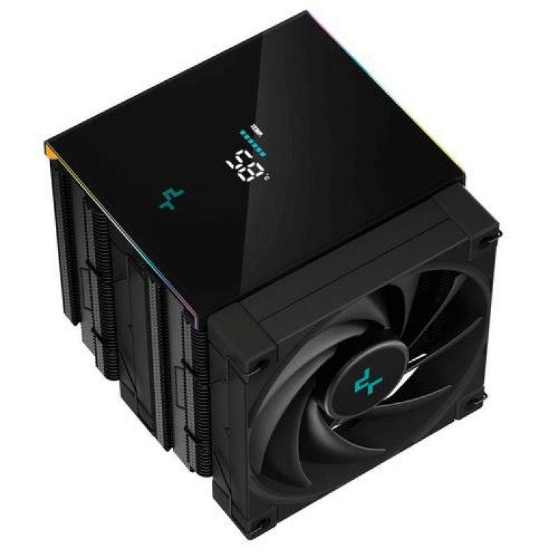 <b>AK620 DIGITAL</b><br>The era of digital air coolers has arrived, and DeepCool is proud to introduce the AK620 DIGITAL. Everything you loved about the AK620 ZERO DARK, but with a sleek low-profile magnetic status display and ARGB LED strips.<br><br><b>AK620 DIGITAL</b><br>WELCOME TO THE DIGITAL ERA<br><br><b>REAL-TIME STATUS SCREEN</b><br>The crystal-clear digital screen displays the temperature and usage of your system's CPU in real time, and there is also a high temperature warning. The display is controlled via a simple application that only requires an open USB 2.0 header.<br><br><b>PROVEN AK ZERO DARK DESIGN</b><br>An all-black edition of the dominant AK620 high-performance CPU cooler. The same premium quality materials, featuring six advanced copper heat pipes, a pure copper coldplate, a dense dual-tower heat sink, and two silent FDB fans, produce a powerful winning formula for high performance cooling in a ZERO DARK raven design.<br><br><b>UNLOCKED POTENTIAL</b><br>Achieve peak performance on your CPU with substantial cooling capacity for high frequency overclocking. The AK620 DIGITAL features maximum heat dissipation power and improved airflow to lower temperatures during demanding system applications.<br><br><b>COOL, QUIET, AND POWERFUL</b><br>Two powerful PWM fans with superior fluid dynamic bearings offer low noise operation without losing cooling output for a perfect balance.<br><br><b>SIMPLE AND SECURE INSTALLATION</b><br>The provided all metal mounting bracket provides an easy installation process that ensures proper contact and equal pressure on both Intel and AMD platforms.DeepCool AK620 DIGITAL. Type: Air cooler, Fan diameter: 12 cm, Maximum airflow: 68.99 cfm, Maximum air pressure: 2.19 mmH2O. Width: 129 mm, Depth: 138 mm, Height: 162 mm. Product colour: Black