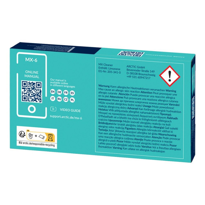 Komplektis olevad puhastuslapid on spetsiaalselt mõeldud termopasta jääkide eemaldamiseks, võimaldades kiiret ja mugavat ettevalmistust uue pasta pealekandmiseks. See muudab Arctic MX-6 komplekti ideaalseks nii professionaalidele kui ka kodukasutajatele, kes soovivad oma seadmete jahutust maksimaalselt tõhustada.