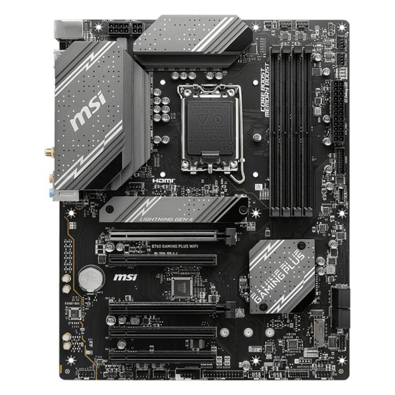 MSI B760 GAMING PLUS WIFI. Protsessori tootja: Intel, protsessori sokkel: LGA 1700, ühilduvad protsessorid: Intel® Celeron®, Intel® Pentium® Gold. Toetatud operatiivmälu: DDR5-SDRAM, maksimaalne RAM-mälu: 192 GB, mälu tüüp: DIMM. Toetatud andmekandjate liidesed: M.2, SATA, RAID-tasemed: 0, 1, 5, 10. Etherneti liidese tüüp: 2.5 Gigabit Ethernet, LAN-kontroller: Dragon RTL8125BG, peamine Wi-Fi standard: Wi-Fi 6E (802.11ax). Komponent: lauaarvuti, emaplaadi vormitegur: ATX, emaplaadi kiibistiku perekond: Intel.