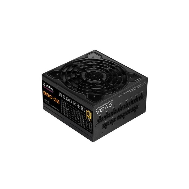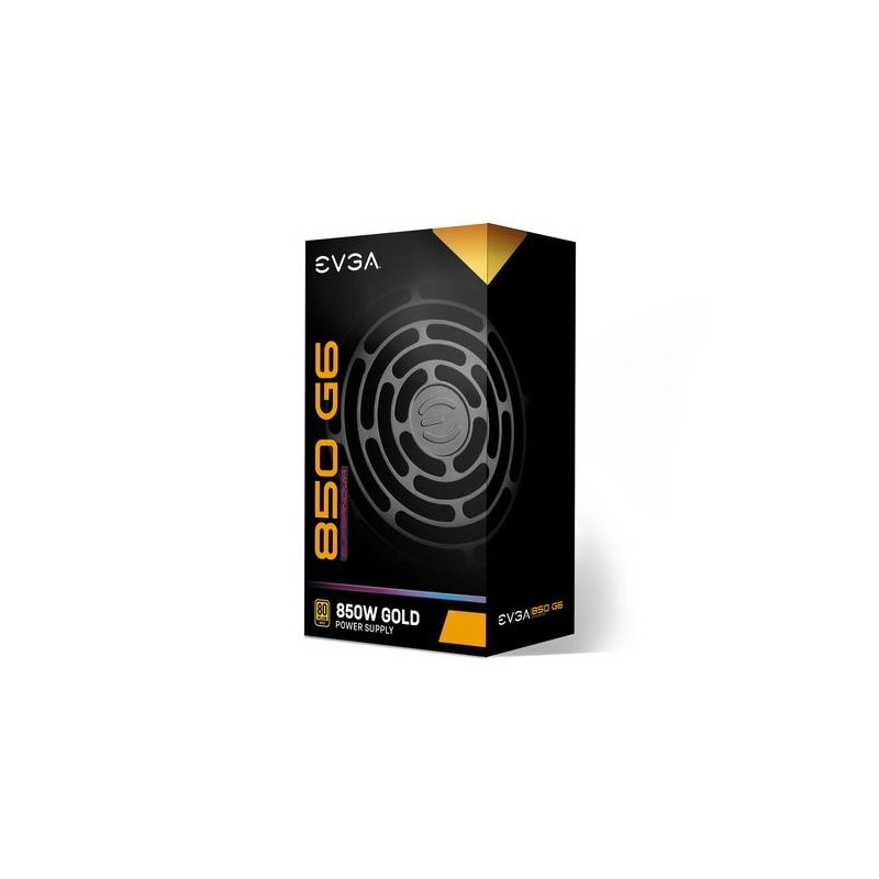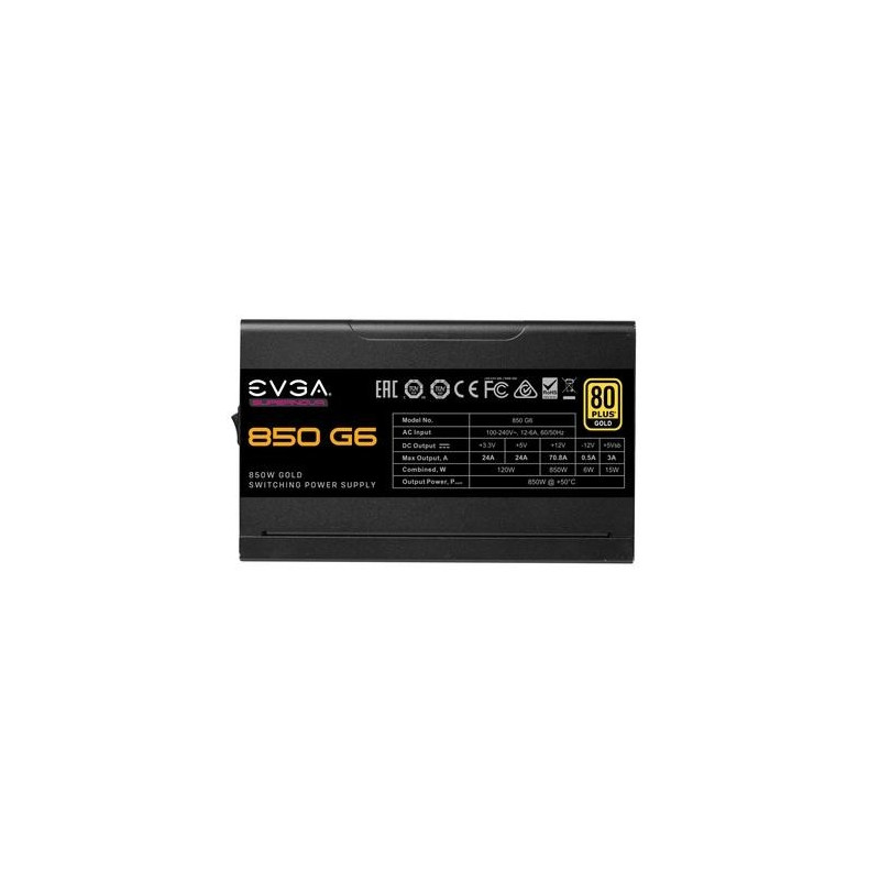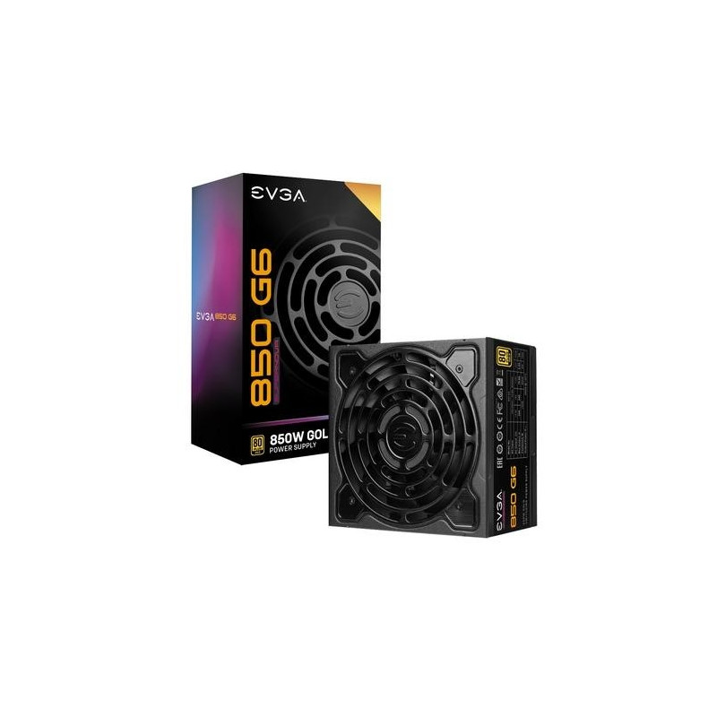 The EVGA SuperNOVA G6 power supplies feature a new platform design, using new materials and better layout placement to achieve greater performance with extremely low ripple and noise in an even smaller chassis.<br><br><b>Next Gen Platform</b><br>With a full-bridge, LLC Resonant Rectification, and DC-DC design, the SuperNOVA G6 provides rock-solid stability, relentless efficiency, and extremely tight voltage regulation.<br><br><b>Hardware + Firmware OPP</b><br>Hardware OPP is designed to trip at 135% max wattage as a last resort to protect the system, but the SuperNOVA G6 also features firmware OPP to anticipate harmful load behavior 5-10% sooner by shutting off the power supply when over-power conditions persist longer than 1ms while avoiding an instantaneous overload trigger protection malfunction during momentary peak wattage.<br><br><b>Smaller Size, Bigger Performance</b><br>The improved efficiency and voltage regulation minimizes heat, allowing the SuperNOVA G6 to be EVGA’s shortest ATX Gold-certified power supply.<br><br><b>ULTRA-QUIET 135MM FDB FAN WITH EVGA ECO MODE</b><br>To reduce noise, the SuperNOVA G6 maximizes the time the power supply stays silent or quiet at low to medium loads when ECO Mode is enabled.EVGA Supernova 850 G6. Total power: 850 W, AC input voltage: 100 - 240 V, AC input frequency: 50 - 60 Hz. Motherboard power connector: 24-pin ATX, Motherboard power cable length: 60 cm, SATA power cable length: 550,650,750 mm. Purpose: PC, 80 PLUS certification: 80 PLUS Gold, Bearing technology: FDB. Product colour: Black, Cooling type: Active, Fan diameter: 13.5 cm. Cables included: AC, CPU, PCIe, Peripheral (Molex), SATA