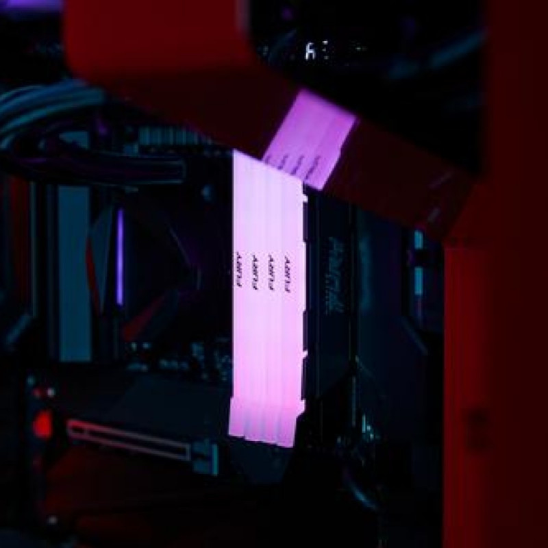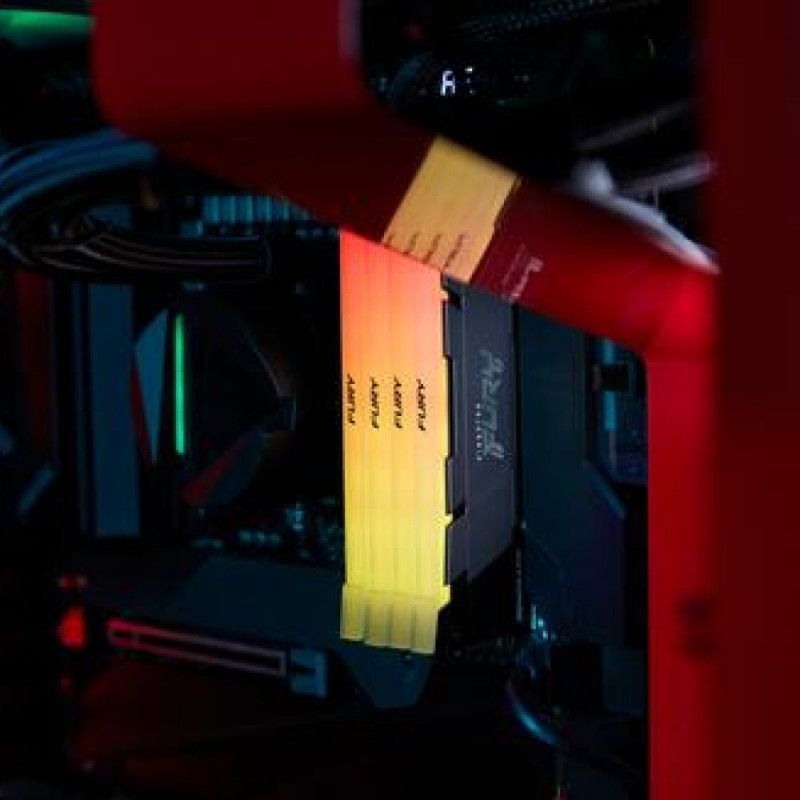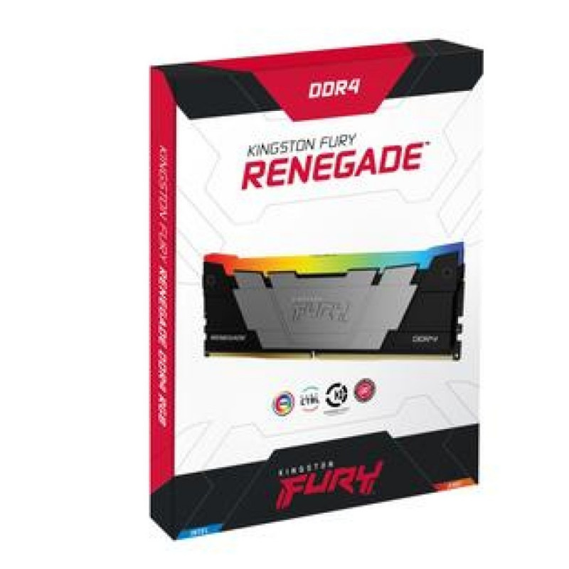 Kingston FURY™ Renegade DDR4 RGB* is the ideal upgrade for the power user who wants cutting-edge performance, with stylish RGB in their AMD- or Intel-based system. 10 LEDs create dynamic RGB lighting with Kingston FURY's patented Infrared Sync Technology™ for smooth, coordinated effects. Put in hours for work or play, crank up your frame rate, improve your workflow and edit gameplay in a flash thanks to speeds of up to 4600MT/s[*]* paired with quick latencies. The intense, stylish two-tone black heat spreader with black PCB is for fun and function to keep your system cool. <br><br>Available in single module capacities of 8GB–32GB and kits of 2, 4 and 8 with capacities of 16GB–256GB. [Kingston FURY Renegade DDR4 RGB is Ready for AMD Ryzen, and Intel® XMP Certified] or XMP Ready.<br><br><b>Stunning RGB style</b><br>Bring your workstation to life with smooth, stunning RGB lighting effects*<br><br><b>Patented Kingston FURY™ Infrared Sync Technology™</b><br>RGB lighting stays synced thanks to Kingston FURY's Infrared Sync Technology<br><br><b>Powerful aluminium heat spreader displays smooth RGB effects</b><br>The two-tone black aluminium heat spreader and black PCB highlight the stunning RGB effects to keep your rig running and looking sharp.<br><br><b>Intel XMP Certified or Read profiles</b><br>Intel Extreme Memory Profile technology makes it possible to overclock with ease. Simply select one of the built-in, hand-tuned profiles in your BIOS to get the benefits of overclocking.<br><br><b>Ready for AMD Ryzen™</b><br>Get memory that’s Ready for Ryzen and will seamlessly integrate with your AMD-based system.Kingston Technology FURY 8GB 3600MT/s DDR4 CL16 DIMM Renegade RGB. Component for: PC, Internal memory: 8 GB, Memory layout (modules x size): 1 x 8 GB, Internal memory type: DDR4, Memory form factor: 288-pin DIMM, CAS latency: 16