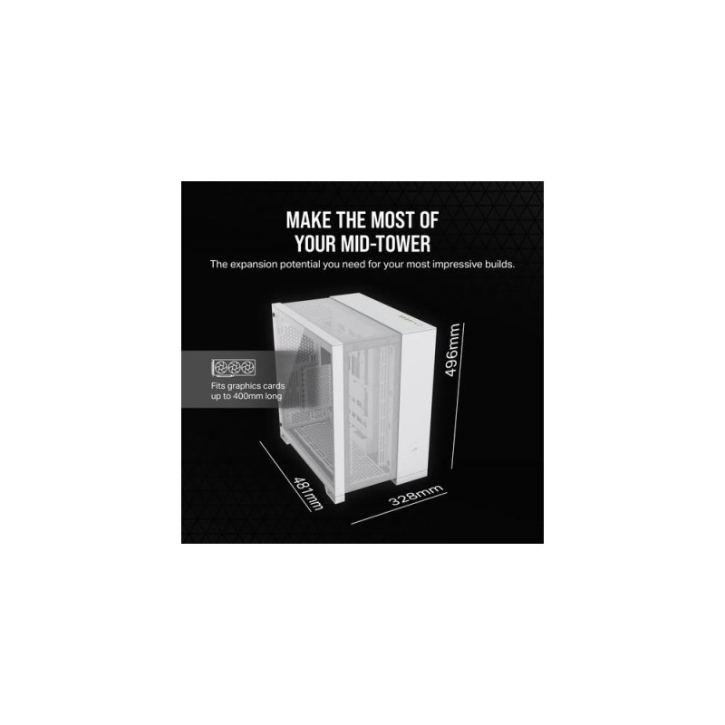 The CORSAIR 6500D AIRFLOW Mid-Tower Dual Chamber PC Case delivers exceptional airflow and cooling with fully mesh paneling and a dual chamber design for an organized, stunning build.<br><br><b>ALL THE DESIGN CHOICES YOU CAN THINK OF CHOOSE YOUR ADVENTURE</b><br>Freedom of choice inside and out. Choose your cooling setup: opt for more glass to showcase your components, or a more subtle airflow configuration – in more than just black or white.<br><br><b>THE CLEANEST LOOK FOR YOUR BUILD<br>DUAL CHAMBER DESIGN</b><br>Show off your cleanest, most organized build in one chamber equipped with a multitude of fan and radiator mounts, while hiding cable routing, storage drives, and your PSU in the second chamber.<br><br><b>KEEP ALL CABLES OUT OF SIGHT<br>A FLAWLESS VIEW</b><br>Take advantage of reverse connector motherboard compatibility (ASUS BTF, MSI PROJECT ZERO) and iCUE LINK and win the war on cables once and for all.<br><br><b>KEEP YOUR TEMPERATURES IN CHECK<br>UNRIVALED AIRFLOW</b><br>Optimal airflow and exceptional cooling thanks to fully mesh front, side, bottom, and roof paneling, ensuring stable performance for your high-end components.<br><br><b>WIDE COOLING FLEXIBILITY</b><br>Customize your cooling setup with room for up to 13x 120mm or 9x 140mm fans, including versatile radiator mounting options for up to 360mm in the front, roof, bottom, and side.<br>- The 6500D AIRFLOW has more than enough space to accommodate and cool your most ambitious build.<br>- Surround your system on all sides with a healthy amount of airflow to keep it running at its peak.<br>- Radiator mounting positions everywhere you look make the 6500D AIRFLOW a custom cooling dream.<br><br><b>MODERN FRONT PANEL I/O</b><br>Puts your connections within easy reach, including a USB 3.2 Gen 2 Type-C Port, 4x USB 3.2 Gen 1 Type-A ports, and a combination audio/microphone jack.<br>1. Reset Button<br>2. 4x USB 3.2 Gen 1 Type-A Ports<br>3. USB 3.2 Gen 2 Type-C Port<br>4. Headphone / Mic Combo Jack<br>5. Power Button<br><br>Corsair 6500D AIRFLOW. Form factor: Midi Tower, Type: PC, Product colour: White. Front radiator sizes supported: 120,140,240,280,360 mm. Supported HDD sizes: 2.5,3.5". Width: 328 mm, Depth: 481 mm, Height: 496 mm