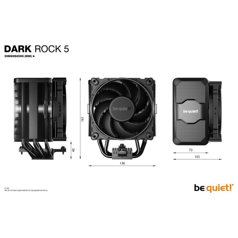be quiet! DARK ROCK 5. Tüüp: Õhkjahutus, ventilaatori läbimõõt: 12 cm, maksimaalne pöörlemiskiirus: 2100 p/min, õhuvool: 93,5 m³/h, maksimaalne õhurõhk: 2,73 mmH2O, laagritüüp: vedelikdünaamiline laager (FDB). Laius: 136 mm, sügavus: 101 mm, kõrgus: 161 mm. Toote värvus: must