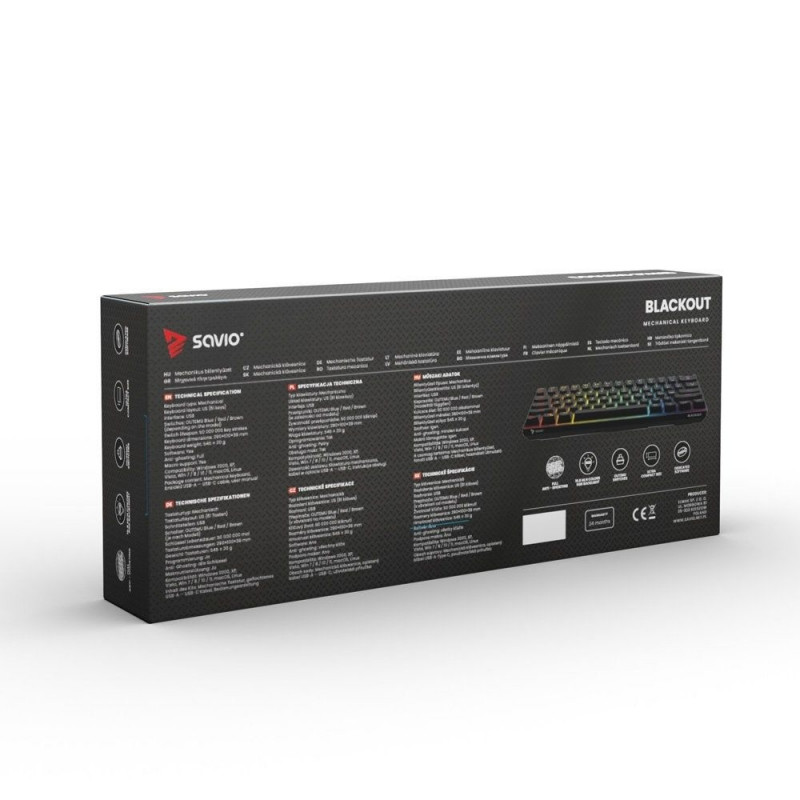 SAVIO mehaaniline klaviatuur BLACKOUT Outemu Blue lülititega on varustatud RGB LED-taustvalgustusega, millel on 16,78 miljonit värvi ja reguleeritav heledus. Klaviatuuril on eemaldatavad klahvikorgid, mis võimaldavad seda kohandada vastavalt isiklikele eelistustele.