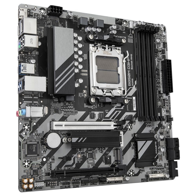 **GIGABYTE B850M D3HP Emaplaat - AMD Ryzen 9000 seeria protsessorid, 5+2+2 faasiline digitaalne VRM, kuni 8200 MHz DDR5 (OC), 1xPCIe 5.0 + 1xPCIe 4.0 M.2, GbE LAN, USB 3.2 Gen 2** - **Protsessoritootja:** AMD - **Protsessori pesa:** AM5 - **Ühilduvad protsessorid:** AMD Ryzen 7000 seeria, AMD Ryzen 8000 seeria, AMD Ryzen 9000 seeria **Toetatud muutmälu:** - **Mälu tüüp:** DDR5-SDRAM - **Maksimaalne RAM-maht:** 256 GB - **Mälu tüüp:** DIMM **Toetatud salvestusseadmete liidesed:** - **Liidesed:** M.2, SATA III - **Toetatud salvestusseadmed:** HDD ja SSD - **RAID tasemed:** 0, 1, 10 **Maksimaalne resolutsioon:** 4096 x 2160 pikslit **Etherneti liidese tüüp:** Gigabit Ethernet