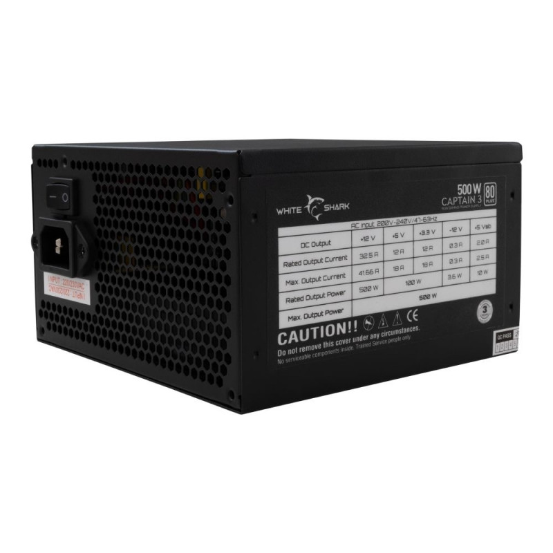 Toite oma mänguseadet White Shark CAPTAIN-3 toiteallikaga. See tagab 500 W väljundvõimsuse ja 80 PLUSi efektiivsuse ning on loodud töökindlaks. RGB-valgustuse, täiustatud turvakaitse ja vastupidava hüdroventilaatoriga hoiab see teie süsteemi jahedana ja turvalisena. Mitme pistiku ja elegantse musta disainiga on see mängijatele ideaalne toitelahendus.Tehnilised andmed Väljundvõimsus (mW): 500 W Ventilaatori mõõtmed (mm): 120 - RGB Kaal (g): 1244 Mõõdud (mm): 140x150x85 Pistikud: 24 x 1, 4/8 x 1, SATA x 6, MOLEX x 4, PCI-E 6/8 x 2 Tüüp: ATX / mittemodulaarne Tõhusus: 80 PLUS standard Turvafunktsioonid: OVP, SCP, OPP, SIP, UVP Toiteallika pikkus (mm): 140 Vooluvool 12V / 5V / 3,3V: 35A/16A/16A Ventilaatori laager: hüdrauliline DC - DC: Jah Materjal: Metall Värv: must