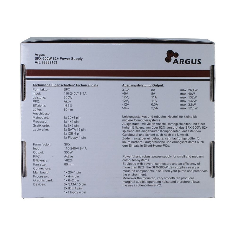 Inter-Tech SFX-300W. Koguvõimsus: 300 W, AC sisendpinge: 110 - 240 V, AC sisendsagedus: 50 - 60 Hz. Emaplaadi toitepistik: 20+4 pin ATX. Otstarve: PC, Toiteploki (PSU) vormitegur: ATX, 80 Plus sertifikaat: 80 PLUS. Toote värv: Hall, Ventilaatori läbimõõt: 8 cm, Ventilaatorite arv: 1 ventilaator. Laius: 125 mm, Sügavus: 100 mm, Kõrgus: 63,5 mm