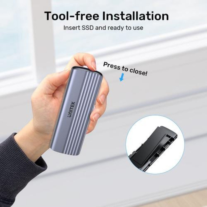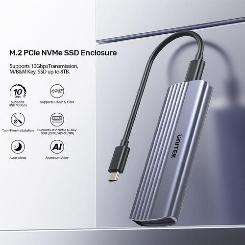 <b>UNITEK M.2 PCIe NVMe SSD enclosure is specially designed to support NMVE protocol with both M or B&M keys and for 2230/ 2242/ 2260/2280 size SSDs up to 8TB.* Supports 10Gbps Transmission , M/B&M Key, SSD up to 8TB.</b><br><br><b>10Gbps Transmission Speed:</b><br>This PCIe NVMe M.2 SSD enclosure equips with USB-C 10Gbps output interface and is backward compatible with USB-C 5Gbps port (USB 3.1 Gen1 and USB 3.0).<br><br><b>Wide Compatibility:</b><br>This PCIe NVMe M.2 SSD enclosure only supports M.2 NVMe M-Key SSD with the size 2230/2242/2260/2280 solid state drivers.*<br><br><b>Effective Heat Dissipation:</b><br>UNITEK PCIe NVMe M.2 SSD enclosure is made of aluminum housing to effectively dissipate the heat and protect your SSD, keeping it at its peak performance.<br><br><b>Optimize SSD for Best Performance:</b><br>This PCIe NVMe M.2 SSD enclosure supports UASP and TRIM. UASP enables faster data transfer to and from storage devices. TRIM can improve write performance, optimize the capacity of SSD and enabling it to last longer.<br><br><b>Tool-Free Installation:</b><br>This PCIe NVMe M.2 SSD enclosure allows quick and easy installation of PCIe NVMe M.2 SSDs, with no tools or driver is required.<br><br><b>Supported Systems:</b><br>Compatible with Windows 7/8/10/11 and Mac OS, Linux, Android, iOSUNITEK S1241B01. Product type: SSD enclosure. Number of storage drives supported: 1, Storage drive size: M.2, Supported storage drive interfaces: PCI Express, Maximum storage capacity: 8 TB. Data transfer rate: 10 Gbit/s. Hot-swap. Product colour: Grey. USB connector type: USB Type-C