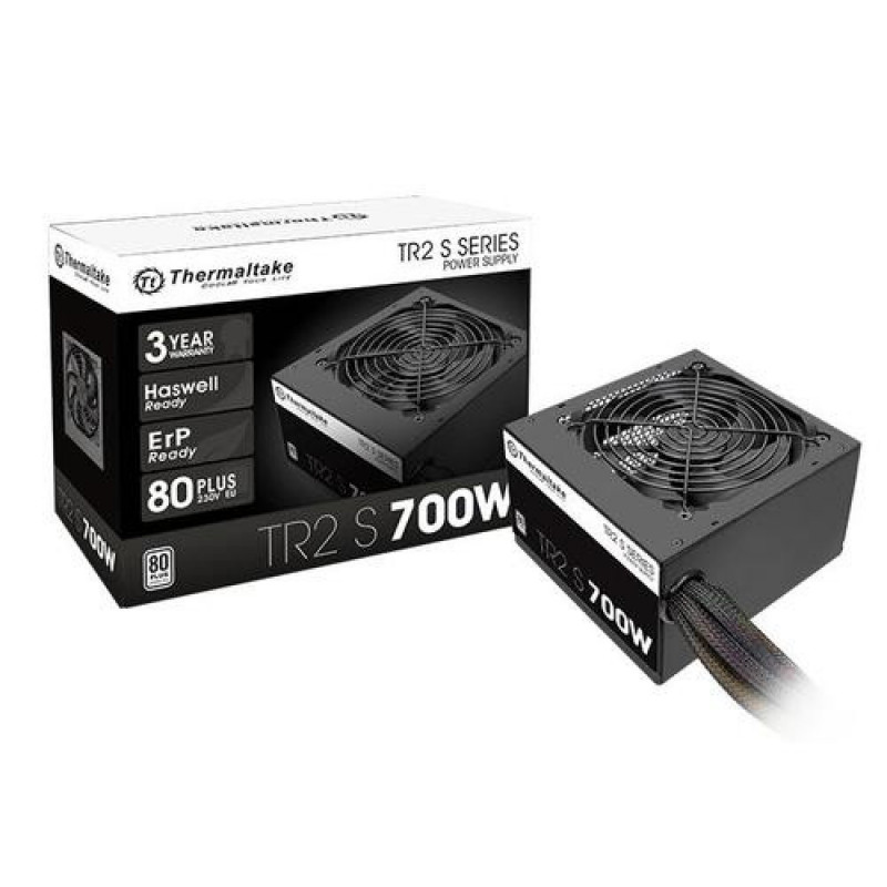 <b>Thermaltake TR2 S 700W</b><br>Incorporating various high-quality components, the new TR2 S Series – models are rated from 500W to 700W – saves energy through its high efficiency of up to 86% and accommodates any mainstream build with the most demanding requirements. An embedded intelligent cooling fan delivers excellent airflow at an exceptionally low noise level. Additionally, the Single +12V rail design enables non-stop usage with stable and reliable performance.<br><br><b>Ultra Quiet 120mm Fan</b><br>TR2 S Series adopt 120mm cooling fan delivers excellent airflow at an exceptionally low noise level.<br><br><b>80 PLUS 230V Standard Certified and Haswell Ready</b><br>TR2 S Series saves energy through its high energy efficiency of up to 86% and is 80 PLUS® 230V Standard Certified.<br><br><b>High-Quality Components</b><br>High quality components enable non-stop usage with stable and reliable performance, no more capacitor explosion and leakage.<br><br><b>Single +12V Output</b><br>TR2 S Series is equipped with powerful +12V rails, superior performance under all types of system loading.Thermaltake TRS-700AH2NK. Total power: 700 W, AC input voltage: 230 V, AC input frequency: 50 - 60 Hz. Motherboard power connector: 20+4 pin ATX, Cabling type: Non-Modular. Purpose: PC, Power supply unit (PSU) form factor: ATX, 80 PLUS certification: 80 PLUS. Product colour: Black, Cooling type: Active, Fan diameter: 12 cm. Certification: CE/CB/TUV