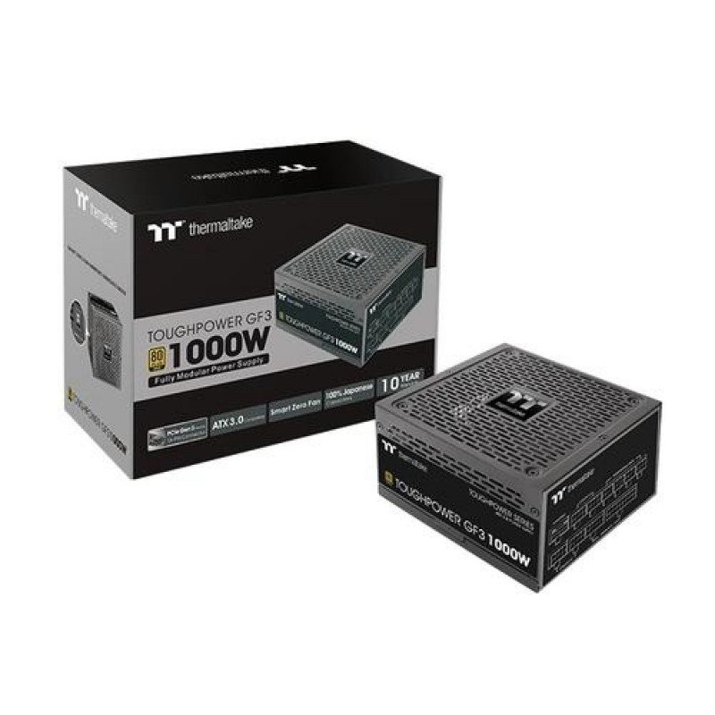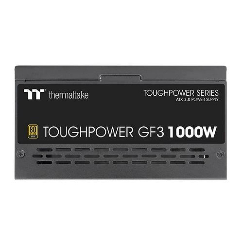 <b>Toughpower GF3 1000W Gold - TT Premium Edition</b><br>PCIe Gen 5.0 Ready! Designed with a native PCIe 12+4pin modular connector, the Toughpower GF3 series is built for the next-gen PCIe 5.0 graphics cards and is compatible with Intel ATX 3.0 specifications. The fully modular Toughpower GF3 series comes in 1650W, 1350W, 1200W, 1000W, 850W and 750W and is built to deliver 80 PLUS Gold efficiency. Aimed at providing the best performance, the Toughpower GF3 1000W includes all the critical features such as < 30mV low ripple noise design, extremely strict voltage regulation < ±2%, Hold up time> 17 milliseconds, and comes with 100% high quality Japanese capacitors and other premium components to help deliver continuous and stable power.<br><br><b>Fully Compatible With Intel PSDG ATX 3.0 Specifications</b><br>Toughpower GF3 series is fully compatible with Intel ATX 3.0 Specifications which supports up to 200% power excursion, reaches 70% low load efficiency and complies with required power supply timing standards. The GF3 series can sustain up to 3x GPU power excursion and 2x total power excursion.<br><br><b>Made to Comply with the Latest Graphics Cards</b><br>As the power consumption of graphics cards has increased, so has their demand for power. The GF3 series is designed to support NVIDIA and AMD graphics cards, ready to supply the graphics card according to their different ways of connections.<br><br><b>PCIe Gen 5.0 Ready</b><br>Toughpower GF3 1000W Gold comes with a 16pin connector to offer powerful and stable performance allowing the PSU to run next-generation GPUs naturally.<br><br><b>Ultra Quiet Smart Zero Fan</b><br>Designed with our Smart Zero Fan, the fan will not spin until the load exceeds 30% of the power supply, minimizing the fan noise.<br><br><b><30mV Low Ripple Noise Design</b><br>Top-end build quality with low ripple noise. All ripples are lower than 30mV on +12V, +5V or +3.3V from 0% to 100% load to ensure a stable operation and keep your performance-critical components to function reliably for longer.<br><br><b>Extremely Strict Voltage Regulation <±2%</b><br>The voltage regulation, more strict than Intel’s standard +5%,-7% for major rails and ±10% for -12V, is set to no more than ±2% for major rails, providing steady clean power through exceptional voltage stability.<br><br><b>Fully Modular Low-Profile Flat Cable</b><br>Offers cable selection for users while powering the system at an advantageous voltage. Low-profile flat black cable makes cable management easier, reduces clutter and increases airflow inside the chassis.<br><br><b>100% High Quality Japanese 105°C/221°F Capacitors</b><br>Providing great durability as well as offering the highest stability, while remaining reliable.<br><br><b>High Amperage Single +12V Rail & High-Class Technologies</b><br>Powerful single +12V rail can properly deliver the power you need for the best compatibility. The use of LLC and DC to DC circuit design provides very stable operation and enhanced voltage regulation.<br><br><b>135mm Fluid Dynamic Bearing fan</b><br>Featuring a 135mm fluid bearing fan to guarantee superior cooling performance.<br><br><b>80 PLUS Gold Certified and Intel C6/C7 States Ready</b><br>Tough power GF3 series saves energy through its high energy efficiency up to 90% and is certified to 80 PLUS® Gold. The series has been optimized to work with all generations of Intel’s processors to achieve maximum energy saving.Thermaltake Toughpower GF3. Total power: 1000 W, AC input voltage: 100 - 240 V, AC input frequency: 50 - 60 Hz. Motherboard power connector: 24-pin ATX, Motherboard power cable length: 60 cm, SATA power cable length: 500,650,800,950 mm. Purpose: PC, 80 PLUS certification: 80 PLUS Gold, Bearing technology: FDB. Product colour: Black, Fan diameter: 13.5 cm, Number of fans: 1 fan(s). Width: 150 mm, Depth: 160 mm, Height: 86 mm