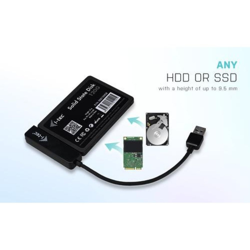 The ADVANCE Series is the highest level of i-tec accessories bringing you the cutting edge technologies of products with a modern design and exclusive packaging.<br><br>i-tec MySafe USB 3.0 Easy is external enclosure for connecting 2.5" SATA disks of all capacities to your PC, notebook, TV or other multimedia device via USB interface, through which is also powered. The enclosure is also suitable for moving data from a damaged notebook. Connecting via USB 3.0 offers easy and high speed data transfer (up to 5 Gbps). Backward compatibility with USB 2.0 is a commonplace.<br><br>Using is very simple, just insert the disk into the enclosure and after first connection to a computer the drivers are automatically installed. For quick connection of disk you can only use a separate adapter of external enclosure or you can carry the disk safely in enclosed plastic box.i-tec MySafe USB 3.0 Easy 2.5" External Case – Black. Product type: HDD/SSD enclosure. Number of storage drives supported: 1, Storage drive size: 2.5", Supported storage drive interfaces: Serial ATA, Serial ATA II, Serial ATA III. Data transfer rate: 5 Gbit/s. Product colour: Black. USB connector type: USB Type-A