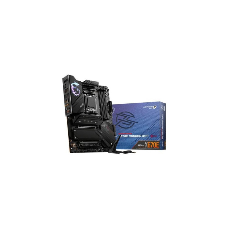 <b>BE AHEAD, POP YOUR STYLE</b><br>The MPG series brings out fashionable products by showing extremely unique styles and expressing a conceited attitude towards the challenge of the gaming world. With extraordinary performance and style, the MPG series defines the future of gaming fashion.<br><br><b>OPTIMIZED FOR WATER COOLING</b><br>Designed to support the most popular All-In-One & customized water cooling solutions on the market. A dedicated water pump PIN header supports up to 3 amp, giving you full control of the water pump speed. A clearly marked ‘keep-out-zone’ allows for easy and safe installation and a perfect fit.<br><br>MSI motherboards let you manage speeds and temperatures for all your system and CPU fans in BIOS and software with a simplified graphical interface. You can also set up to 4 temperature targets, which will adjust the fan speeds automatically.<br><br><b>DIY 2.0 – INTEGRATING WITH THE SYSTEM ENVIRONMENT</b><br>Connect and synchronize with MSI coolers and cases with strategically positioned pin-header locations including a dedicated pump-fan header.<br><br><b>LIGHTNING GEN 5 PCI-E</b><br>Doubling over the previous generation, the bandwidth of a x16 interface can reach 128GB/s.<br><br><b>SMT PCIE 5.0 SLOT</b><br>The advanced SMT(Surface Mount Technology) PCIE slot diminish interference and electrical noise, fully support the PCI-E 5.0 signal.<br><br><b>REINFORCED,</b><br><b>HEAVY SOLDERED CONNECTIONS</b><br>Secure to the motherboard with extra solder points and support the weight of heavy graphics cards.<br><br><b>FAST AND FUTURE-READY STORAGE</b><br>MSI MPG series motherboards support all the latest storage standards, which allows users to connect any ultra-fast storage device. Start games faster, load levels faster and have a real advantage over your enemies.<br><br><b>DOUBLE BANDWIDTH WITH LIGHTNING USB 3.2 GEN 2X2 20G</b><br>Using USB 3.2 devices has never been faster! MPG X670 series motherboards offer a wide variety of options to connect and boost your USB devices, offering never before seen USB speeds up to 20Gb/s when connecting the Rear USB Type-C.<br><br><b>GLOW YOUR PC</b><br>Splash on some color and vibrant RGB lighting effects using MSI Mystic Light with 16.8 million colors and fancy LED effects. MSI Mystic Light provides you complete control of RGB lighting of your PC in one software.<br><br><b>HIGH-BANDWIDTH AND LOW-LATENCY NETWORK</b><br>MSI's premium network solution provides incredible data transfer speed for demanding users.<br><br><br><br><br>MSI MPG X670E CARBON WIFI. Processor manufacturer: AMD, Processor socket: Socket AM5, Compatible processor series: AMD Ryzen™ 7. Supported memory types: DDR5-SDRAM, Maximum internal memory: 128 GB, Memory slots type: DIMM. Supported storage drive interfaces: M.2, SATA II, Supported storage drive types: HDD & SSD, RAID levels: 0, 1, 10. Ethernet interface type: 2.5 Gigabit Ethernet, LAN controller: Realtek RTL8125-BG, Top Wi-Fi standard: Wi-Fi 6E (802.11ax). Component for: PC, Motherboard form factor: ATX, Motherboard chipset family: AMD