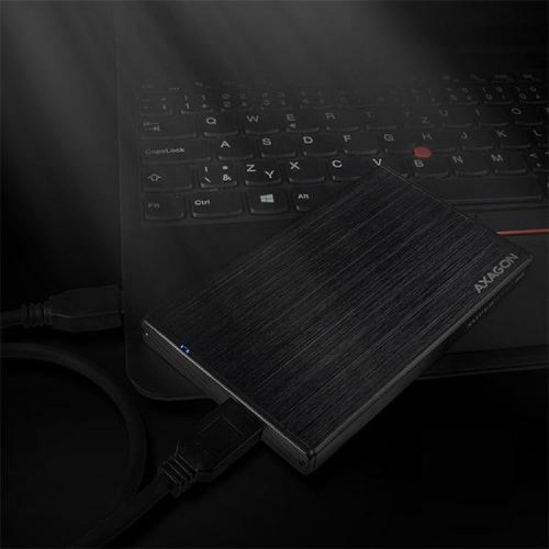 The compact aluminium AXAGON EE25-XA6 ALINE external box with USB 3.2 Gen 1 (USB 3.0) interface designed for 2.5" SATA hard disks or SSDs.<br><br>The SATA 6G interface with UASP support allows you to enjoy the speed of modern SSD disks.<br><br>The TRIM feature support limits the gradual degradation of SSD performance over time.<br><br>Reading of S.M.A.R.T. information monitoring the condition of the external disk. Supports spinning down of connected disks as well as the box.<br><br>Lightweight yet durable cast aluminum case for perfect mechanical protection of the disk and excellent heat dissipation.<br><br>The decently shaped case with a brushed surface that provides elegant look and prevents unwanted fingerprints.<br><br>Easy installation of the hard disk as well as automatic installation can be handled even by a layman and easily create an external disk.<br><br>Input:<br>• USB 3.2 Gen 1 (USB 3.1 Gen 1 / USB 3.0) SuperSpeed USB transpission rates up to 5 Gbit/s.<br>• Connection via micro USB type B female conector.<br><br>Device support:<br>• SATA III - 6 Gb/s (600 MB/s) interface, <br>• Supports 2.5“ HDD/SSD.<br><br>Features:<br>• Compatible with USB 3.2 Gen 1 / USB 3.1 Gen 1 / USB 3.0 and backward compatible with USB 2.0.<br>• Supports transmission rates 5000 / 480 Mbit/s (SuperSpeed / HighSpeed).<br>• Supports 2.5" SATA III/II/I SSD and HDD of a max. height 9.5 mm without limiting maximum capacity.<br>• Compliant with Serial ATA 3.0 specification (SATA/600), transmission rates of up to 6 Gb/s(600 MB/s).<br>• Compliant with Serial ATA 2.0 specification (SATA/300), transmission rates of up to 3 Gb/s (300 MB/s).<br>• Compliant with Serial ATA 1.0 specification (SATA/150), transmission rates of up to 1.5 Gb/s (150 MB/s).<br>• The total bandwidth / transmission rate of the box is determined by the USB interface used (theor. 5 Gbit/s).<br>• Supports UASP (USB Attached SCSI Protocol).<br>• SSD/HDD boot support in external box.<br>• Possibility to connect your device while running thanks to the Hot Plug support.<br>• Full Plug and Play support.<br>• HDD Auto Spindown - automatic spindown of a disk after period of inactivity lasting 10 minutes.<br>• HDD Turn Off - turns off the disk after removing the device or spinning down the PC.<br>• Connection via micro USB 3.2 B female connector.<br>• micro USB-B / USB-A cable 64 cm cable long is included.<br>• Supplying the power via USB 3.2 Gen 1 bus up to 900mA from one USB port is sufficient in all cases.<br>• Non-dazzling blue, decent LED indicates the connection to the computer's USB port (permanent light) and the data transmission (blinking).<br>• Very simple disk installation - the disk is connected directly into the SATA connector of the motherboard, and inserted into the box body; the front is fastened with two screws using a screwdriver that is included.<br><br>Other features:<br>• Compact dimensions 130 x 78 x 12.5 mm.<br>• External box weight 75 g (without USB cable and disk).<br><br>Supported OSs:<br>MS Windows XP / Vista / 7 / 8 / 8.1 / 10 and later, Windows Server 2003 / 2008 / 2012 / 2016 and later (supported are all 32- and 64-bit Windows OS versions), Mac OS X 10.x and higher, Linux with kernel 2.6.x and above.<br>Note: Drivers are included with supported operating systems and are installed completely automatically. No other drivers need to be installed and are not even available.<br><br>Package contains:<br>• USB 3.2 Gen 1 2.5" external box for SATA SSD,<br>• micro USB-B - USB-A cable 64 cm long,<br>• mounting screws and the screwdriver,<br>• a multilingual manual CZ/DE/DK/ENG/ESP/FIN/FR/GR/HR/HU/IT/NL/PL/PT/RO/RU/SK/SWE/BG/CN/TR/ARA,<br>• packed in a cardboard box.Axagon EE25-XA6. Product type: HDD/SSD enclosure. Number of storage drives supported: 1, Storage drive size: 2.5", Supported storage drive interfaces: Serial ATA, Serial ATA II, Serial ATA III. Data transfer rate: 5 Gbit/s. Product colour: Black. USB connector type: Micro-USB B
