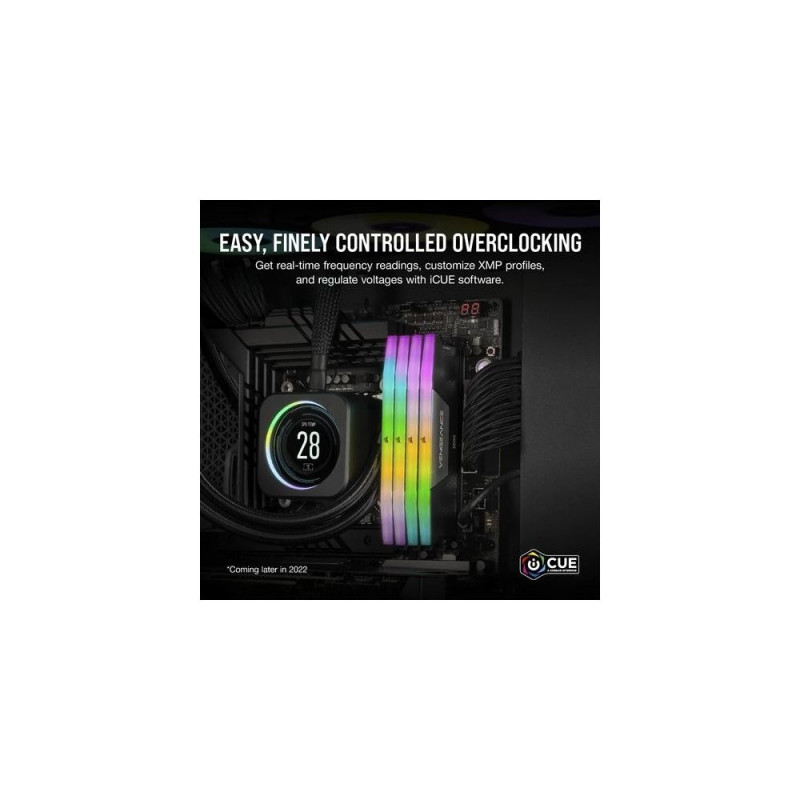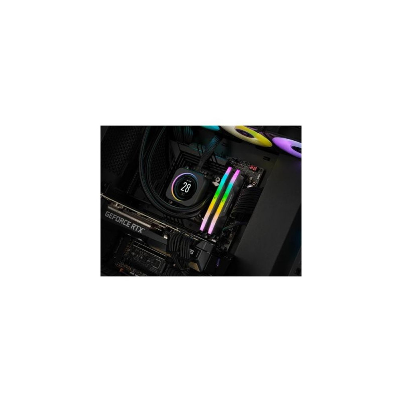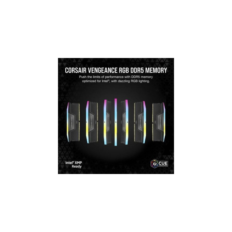 <b>VENGEANCE RGB DDR5 DRAM<br>DDR5 DRAM FOR INTEL</b><br>Push the limits of your system like never-before with DDR5, unlocking even faster frequencies, greater capacities, and better performance.<br><br><b>DO IT ALL, AND DO IT FASTER</b><br>In the multi-core era, the unprecedented processing speed of DDR5 DRAM ensures your high-end CPU gets data quickly with ease. Whether you are gaming, creating content, opening 100 tabs, or multi-tasking, your gaming PC can power through complex tasks faster than ever before.<br><br><b>DYNAMIC TEN-ZONE RGB LIGHTING</b><br>Illuminate your system with ten individually addressable, ultra-bright RGB LEDs per module, encased in a panoramic light bar.<br>Select from dozens of stunning pre-set lighting profiles, or create your own with near-limitless customization in iCUE.<br><br><b>ONBOARD VOLTAGE REGULATION</b><br>You have the power and the control. Built-in voltage regulation plus iCUE software control makes for easier, finely-tuned output that provides more stable overclocking than ever.<br><br><b>CUSTOM INTEL® XMP 3.0 PROFILES</b><br>Ditch the tedious process of manually adjusting your performance settings each time when you save your own XMP profiles through iCUE.<br>Easily customize and tailor your setting profiles by app or task for greater efficiency.<br><br><b>MAXIMUM BANDWIDTH, TIGHT RESPONSE TIMES</b><br>Optimized for maximum bandwidth and tight response times on the latest Intel® DDR5 compatible motherboards.<br><br><b>HAND-SORTED, TIGHTLY-SCREENED MEMORY CHIPS</b><br>Ensure consistent high-frequency performance with aggressive timing options.<br><br><b>CUSTOM PERFORMANCE PCB</b><br>Guarantees signal quality and stability, for superior overclocking ability.<br><br><b>SOLID ALUMINUM HEATSPREADER</b><br>Conducts heat away from your memory quickly, with refined VENGEANCE dual-tone styling to fit the look of modern systems.<br><br><b>WIDE COMPATIBILITY</b><br>Optimized for the latest generation of DDR5 compatible INTEL® Motherboards.Corsair DDR5 96GB PC 6800 CL40 KIT (2x48GB) VENGEANCE RGB B retail. Component for: PC/Server, Internal memory: 96 GB, Memory layout (modules x size): 2 x 48 GB, Internal memory type: DDR5, Memory clock speed: 4800 MHz, Memory form factor: 288-pin DIMM, CAS latency: 40