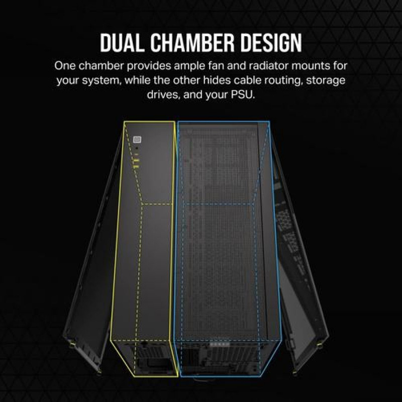 The CORSAIR 2500X Mid-Tower Dual Chamber PC Case delivers exceptional airflow and cooling with fully mesh paneling and a dual chamber design for an organized, stunning build.<br><br><b>ALL THE DESIGN CHOICES YOU CAN THINK OF<br>CHOOSE YOUR ADVENTURE</b><br>Freedom of choice inside and out. Choose your cooling setup: opt for more glass to showcase your components, or a more subtle airflow configuration – in more than just black or white.<br><br><b>THE CLEANEST LOOK FOR YOUR BUILD<br>SMALL BUILD, LOTS OF SPACE</b><br>The 2500 Series can house a powerhouse PC with an impressively small footprint. Ensure that your build is clean, organized, and well cooled in the primary chamber while hiding cable routing, storage drives, and your PSU in the second chamber.<br><br><b>KEEP ALL CABLES OUT OF SIGHT<br>A FLAWLESS VIEW</b><br>Take advantage of reverse connector motherboard compatibility (ASUS BTF, MSI PROJECT ZERO) and iCUE LINK and win the war on cables once and for all.<br><br><b>KEEP YOUR TEMPERATURES IN CHECK<br>ZERO COMPROMISE AIRFLOW</b><br>The 2500X doesn't just look cool. Fan and radiator mounts all around ensure enough airflow for any flagship build.<br><br><b>WIDE COOLING FLEXIBILITY</b><br>Customize your cooling setup with room for up to 9x 120mm or 6x 140mm fans, including versatile radiator mounting options for up to 240mm in the side, and up to 360mm in the roof and bottom.<br>- The 2500X has more than enough space to accommodate and cool your most ambitious build.<br>- Surround your system on all sides with a healthy amount of airflow to keep it running at its peak.<br>- Radiator mounting positions everywhere you look make the 2500X a custom cooling dream.<br><br><b>MODERN FRONT PANEL I/O</b><br>Puts your connections within easy reach, including a USB 3.2 Gen 2 Type-C Port, 2x USB 3.2 Gen 1 Type-A ports, and a combination audio/microphone jack.<br>1. Reset Button<br>2. 2x USB 3.2 Gen 1 Type-A Ports<br>3. USB 3.2 Gen 2 Type-C Port<br>4. Headphone / Mic Combo Jack<br>5. Power ButtonCorsair 2500D AIRFLOW. Form factor: Midi Tower, Type: PC, Product colour: Black. Front radiator sizes supported: 120,140,240,280,360 mm. Width: 304 mm, Depth: 469 mm, Height: 376 mm