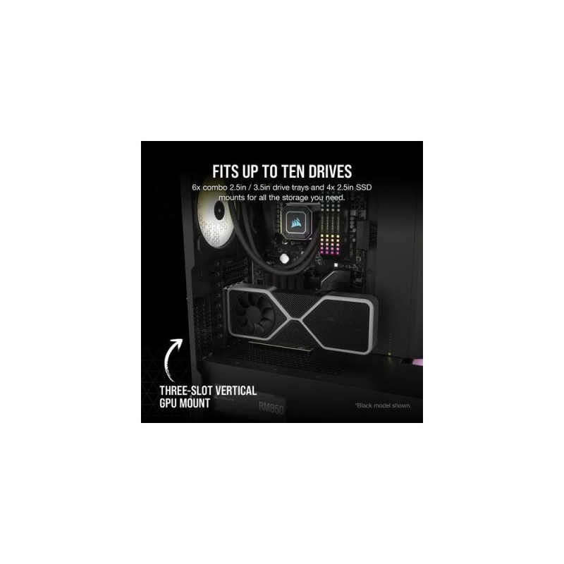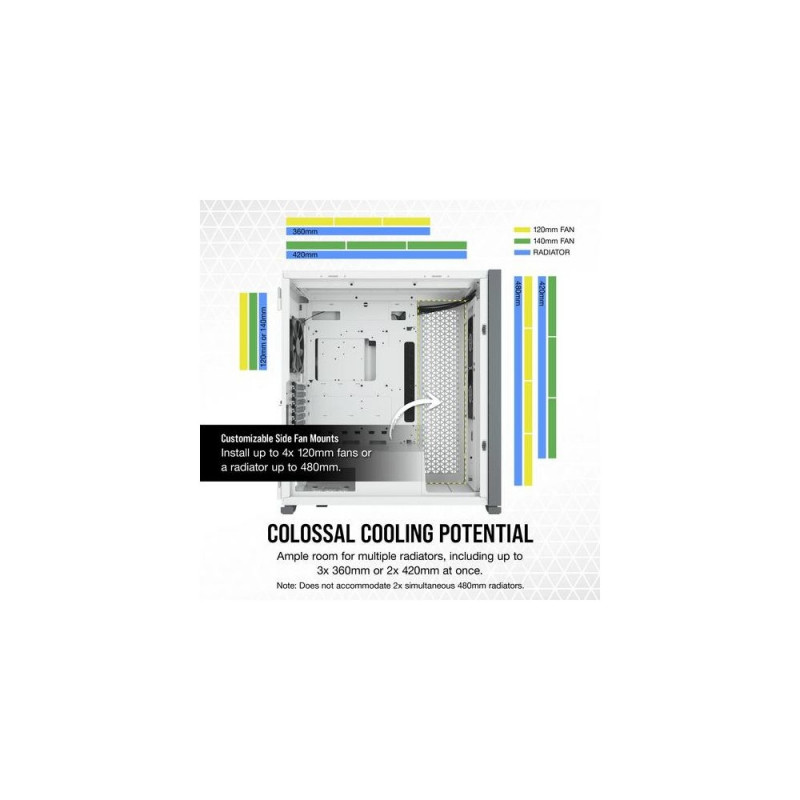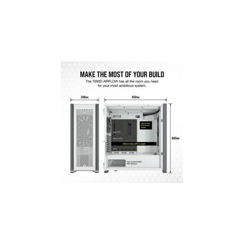 The CORSAIR 7000D AIRFLOW is a full-tower ATX case for the most ambitious builds, offering incredible cooling potential with an airflow- optimized steel front panel, hidden cable management, and three included CORSAIR AirGuide fans.<br><br><b>EXPLORE THE 7000D AIRFLOW</b><br>The roomy interior, massive airflow, and smart design of the 7000D AIRFLOW opens up a world of possibilities for creative and unforgettable builds.<br><br><b>GET SOME BREATHING ROOM</b><br>The 7000 series is one of the most fully-featured full-towers on the market, with massive expansion capabilities.<br><br><b>BUILD YOUR Masterpiece</b><br>The CORSAIR 7000D AIRFLOW is a full-tower ATX case for the most ambitious builds, with an airflow-optimized steel front panel for maximum air intake and three included 140mm AirGuide fans. CORSAIR RapidRoute cable management easily keeps your cables hidden from sight, while a massive interior enables a multitude of cooling options, including room for up to three simultaneous 360mm radiators.<br><br><b>A FULLY-FEATURED FULL-TOWER</b><br>Even in cases as big as these, it's the little things that make all the difference. From flexible storage and cooling options to tool-free swing-out side panels and clean cable management, every element of the 7000 Series helps you make your most ambitious build a reality.<br><br><b>Powerful directed Airflow</b><br>Equipped with three included CORSAIR 140mm AirGuide fans with anti-vortex vanes for concentrated airflow.<br><br><b>Take command of your cooling</b><br>A PWM fan repeater controls the included fans, with connections for up to six in total. Reduce fan speed when you want to keep your system quiet, or increase when you want to push its performance, all from a single 4-pin PWM header on your motherboard.<br><br><b>ALL-AROUND EASY ACCESS</b><br>Two steel high-airflow panels and a sturdy 4mm thick tempered glass side panel offer outstanding airflow and a clear view of your system.<br><br><b>THREE-SLOT VERTICAL GPU MOUNT</b><br>Put the spotlight on your graphics card with an innovative vertical GPU mount, big enough to fit today's most powerful graphics cards with plenty of room for airflow.<br><br><b>SHOW US WHAT YOU'VE GOT</b><br>A removable, customizable windowed PSU shroud shows off the heart of your system. Remove the panel, add vinyl graphics, laser-etch your own logo, or add backlighting to make your rig stand out.<br><br><b>CORSAIR RapidRoute Cable Management</b><br>Quickly and easily route your major cables through a single hidden channel, with a roomy 25mm of space behind the motherboard for all of your cables, easily concealed by a hinged steel door.Corsair 7000D AIRFLOW. Form factor: Full Tower, Type: PC, Product colour: White. Power supply location: Bottom, Supported power supply form factors: ATX. Front fans installed: 2x 140 mm, Front fans diameters supported: 120,140 mm, Rear fans installed: 1x 140 mm. Supported HDD sizes: 2.5,3.5". Width: 248 mm, Depth: 550 mm, Height: 600 mm